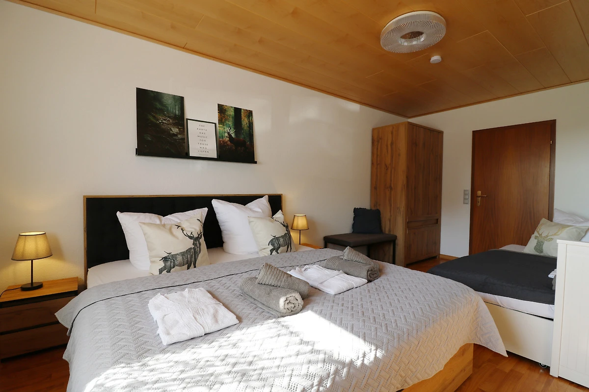 - 1 Schlafzimmer im EG mit Doppelbett (180 x 200), Einzelbett ausziehbar zum Doppelbett und TV