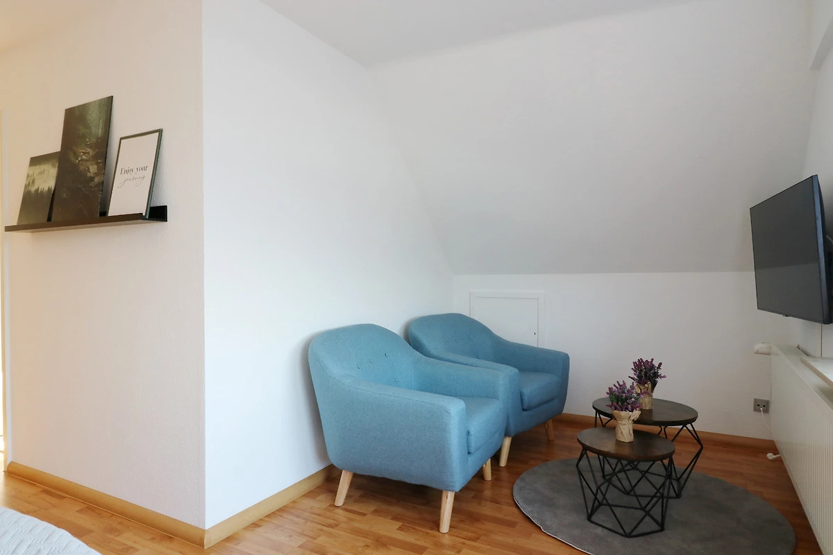 - 1 Wohn-/Schlafzimmer mit TV, Schlafsofa und Essplatz
