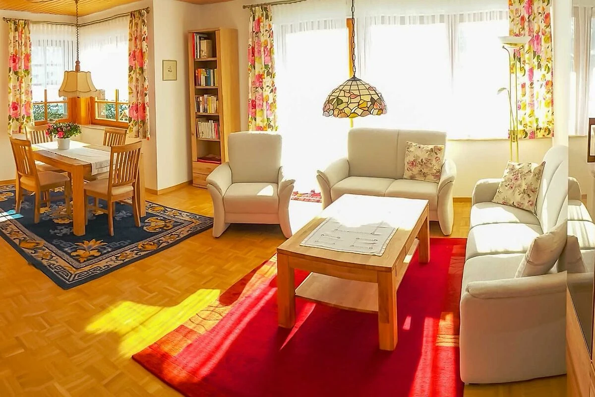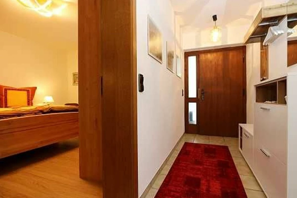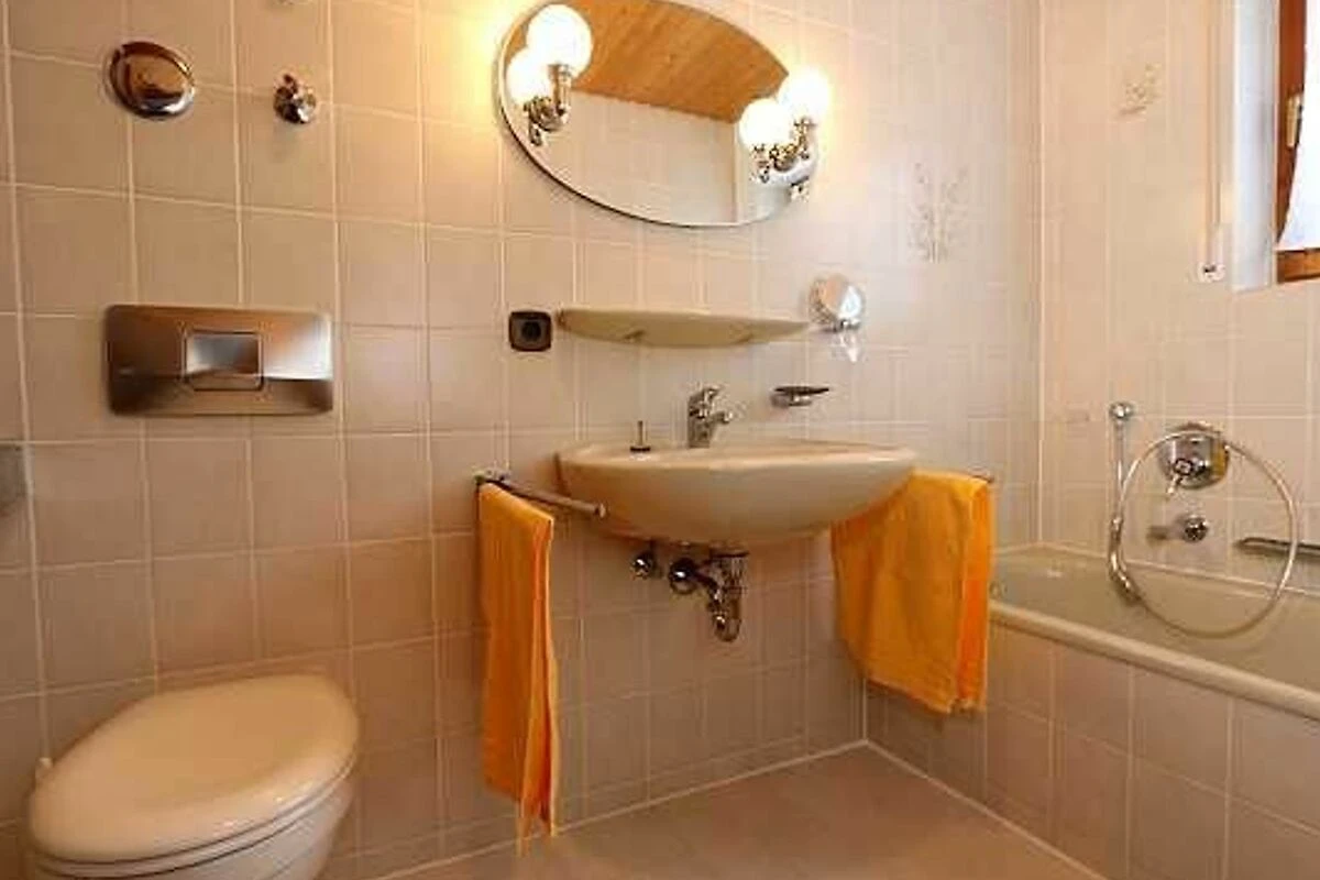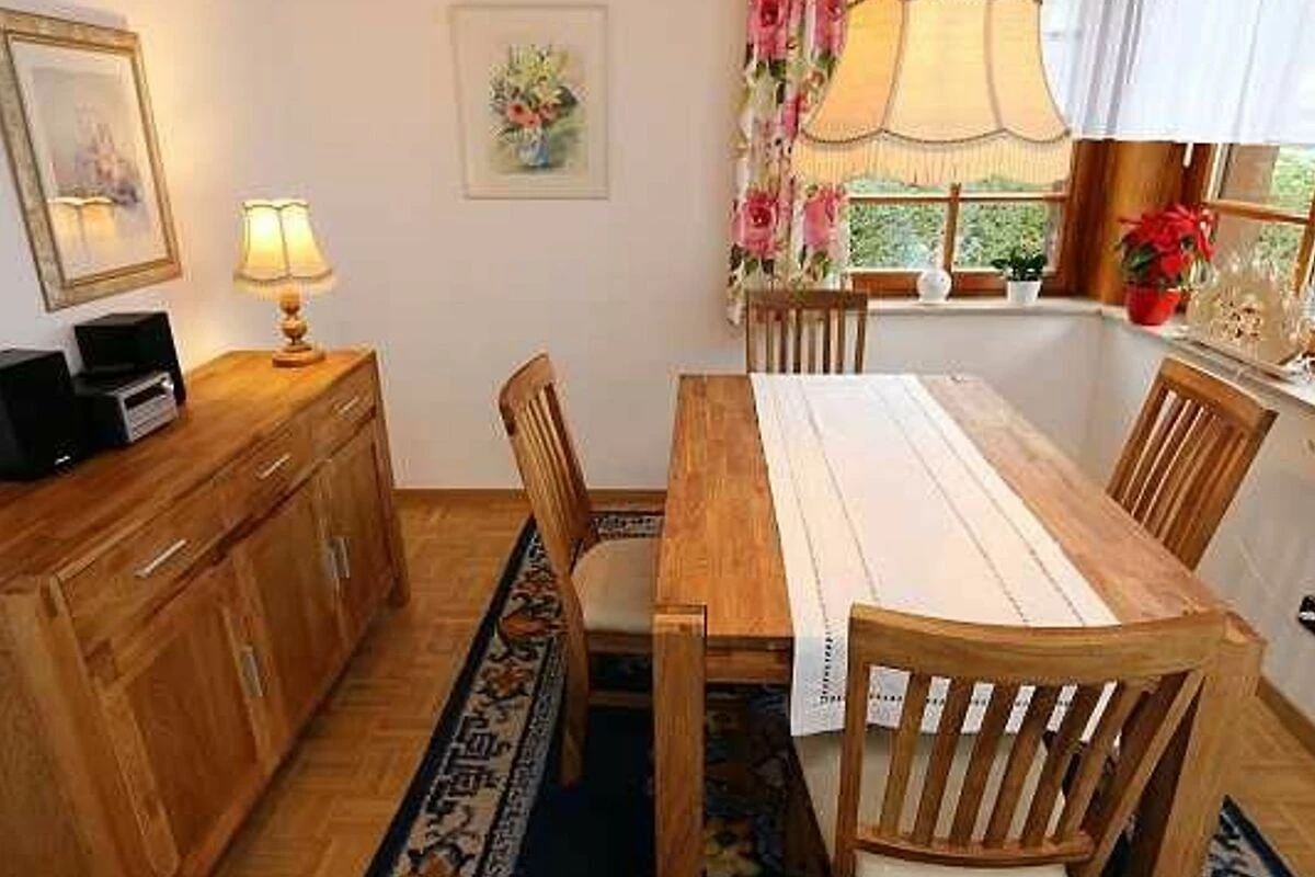 Die im OG befindliche grosszügige Wohnung besteht aus 3 Zimmern, die alle sehr liebevoll eingerichtet sind. Hier können Sie sich wohl- fühlen, entspannen und wunderbar in der ruhigen Atmosphäre unseres Hauses erholen. Die Wohnung hat eine komplette Wohnküche, die umfassend eingerichtet ist. Ein sehr gemütliches Wohnzimmer mit grossem TV , rückengerechter Couchgarnitur, Leseecke mit Sessel, Südbalkon sorgt für Entpannung und Ruhe. Das Schlafzimmer hat ein grosses Doppelbett mit sehr guten Matratzen, zusätzlich eine Couch zur kurzen Ruhe und hochwertige Betten zur Auswahl je nach Jahreszeit. Das Bad hat eine getrennte Dusche, Badewanne, 2 Waschbecken und ein WC..