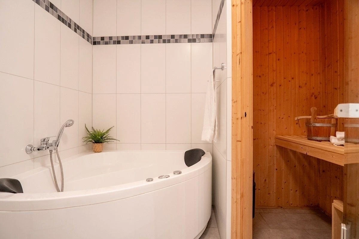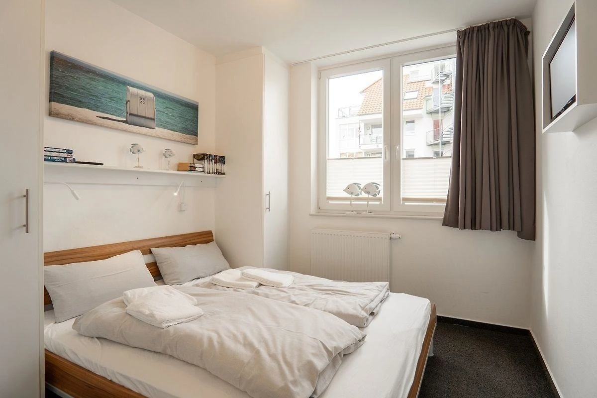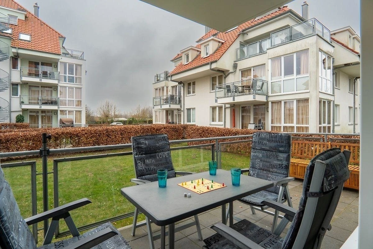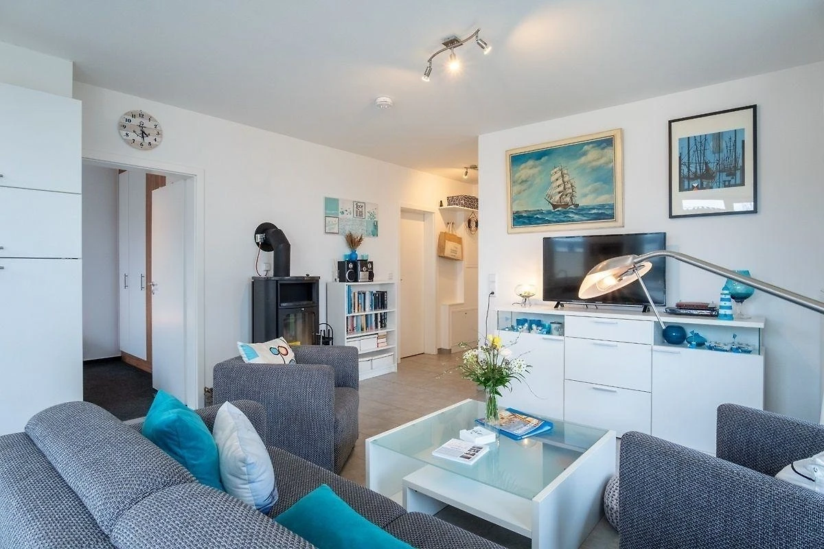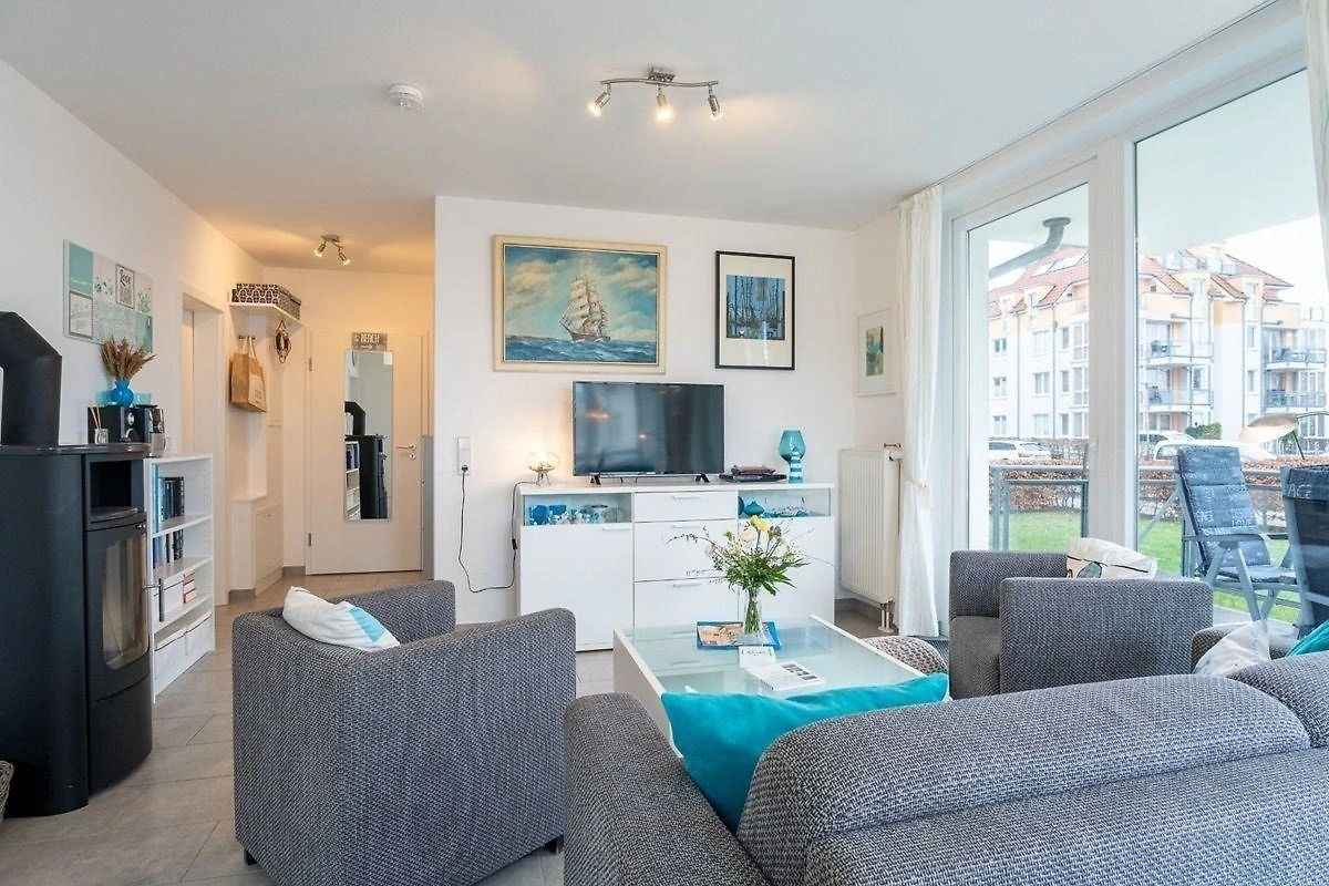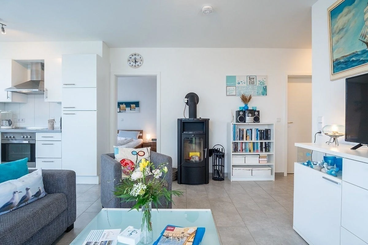 Die Wohnung verfügt über einen lichtdurchfluteten Wohnbereich mit einer gemütlichen Sitzecke mit Kaminofen, einer Essecke mit Blick ins Grüne und der angrenzenden offenen Küchenzeile. Vom Wohnbereich aus gelangt man auf die Terrasse, man kann die Ostsee schon riechen. Beide Schlafzimmer sind mit bequemen Doppelbetten ausgestattet.
