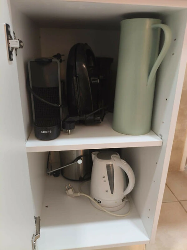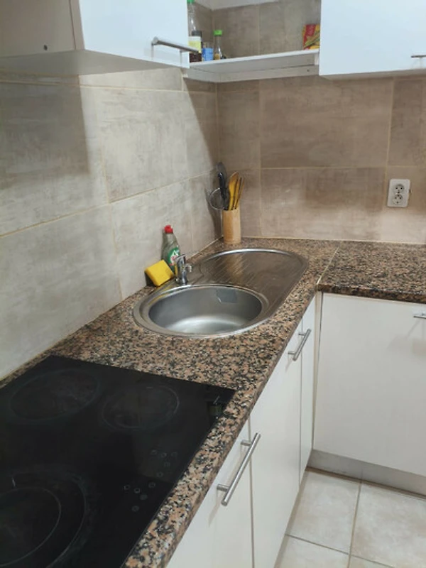 Dieses offene küche, mit ceranfeld, ist ausgestattet in kühlschrank, gefrierschrank, geschirr/besteck, kochutensilien, kaffeemaschine, toaster und saftpresse.