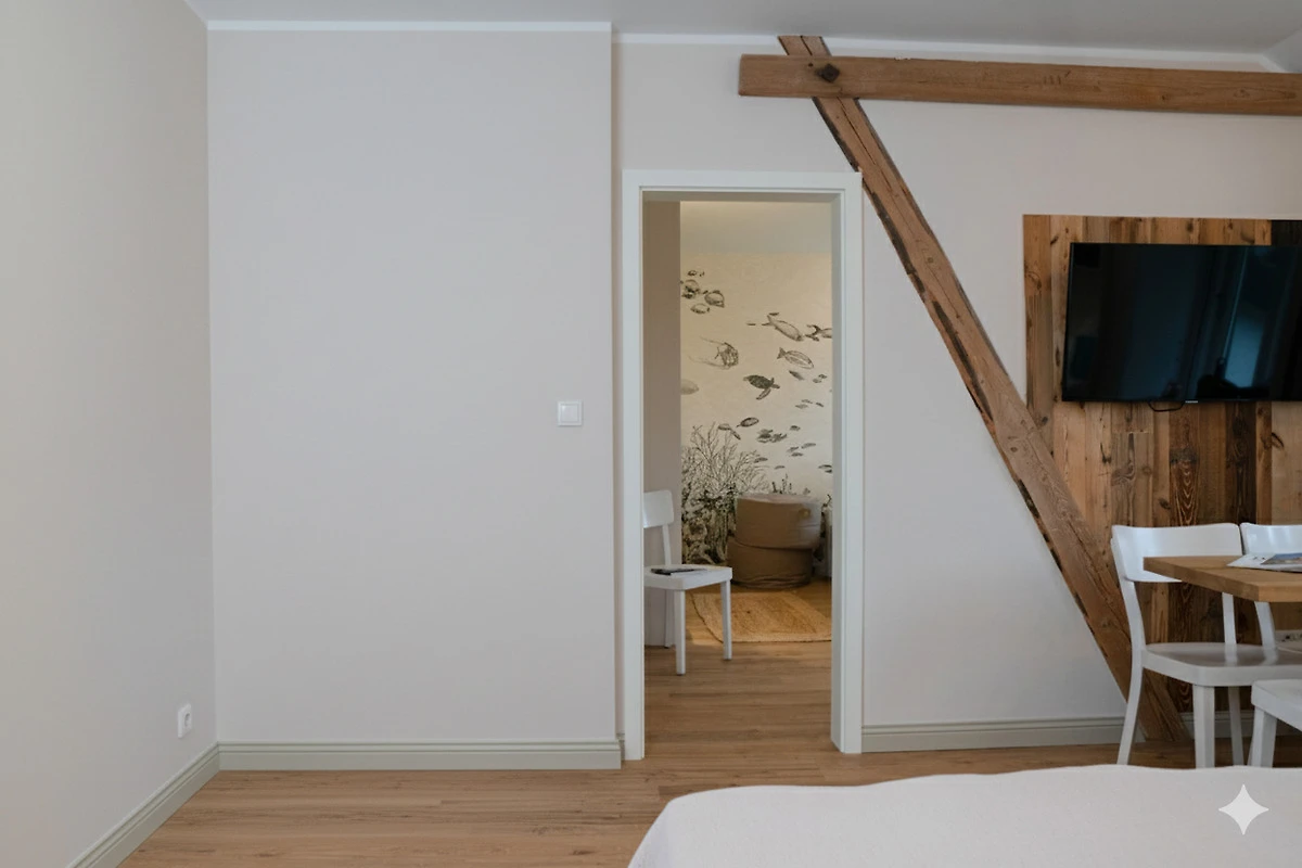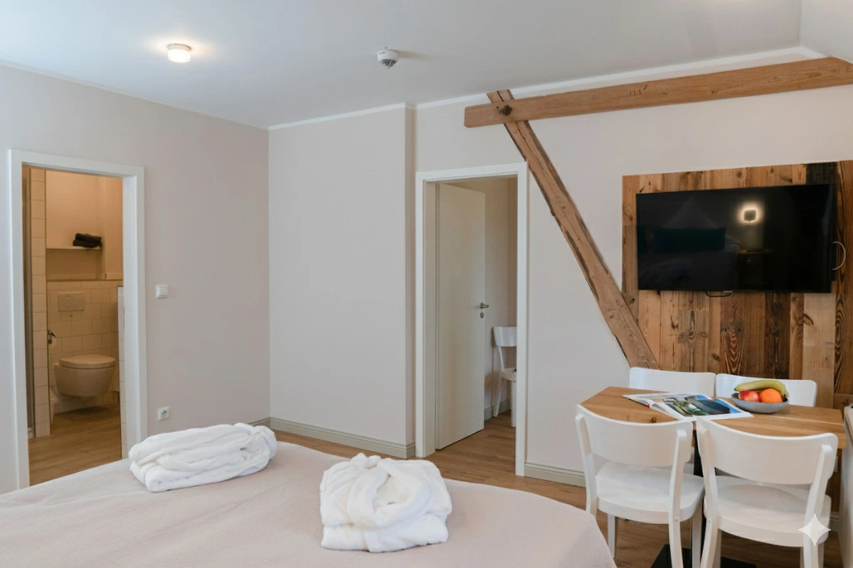 Das Familienzimmer 14 ist in ein Wohn-Schlafzimmer mit einem Doppelbett, ein Schlafzimmer mit einem Einzelbett und einem Stockbett, sowie ein Duschbad unterteilt und bietet somit komfortabel Platz für bis zu 5 Personen zuzüglich einer Kleinkinderaufbettung.
