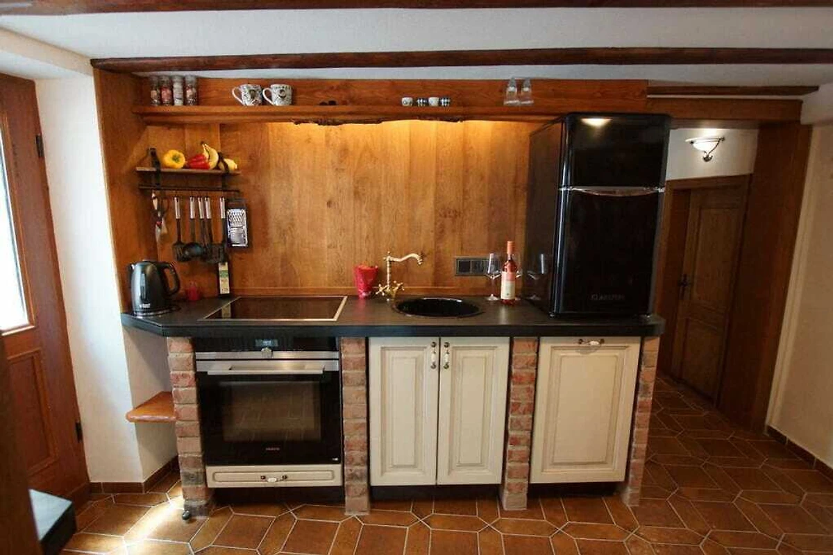 Massive Schiefer/Eichenholz Küche mit Induktionsherd, Spülmaschine und Kaffeevollautomat.