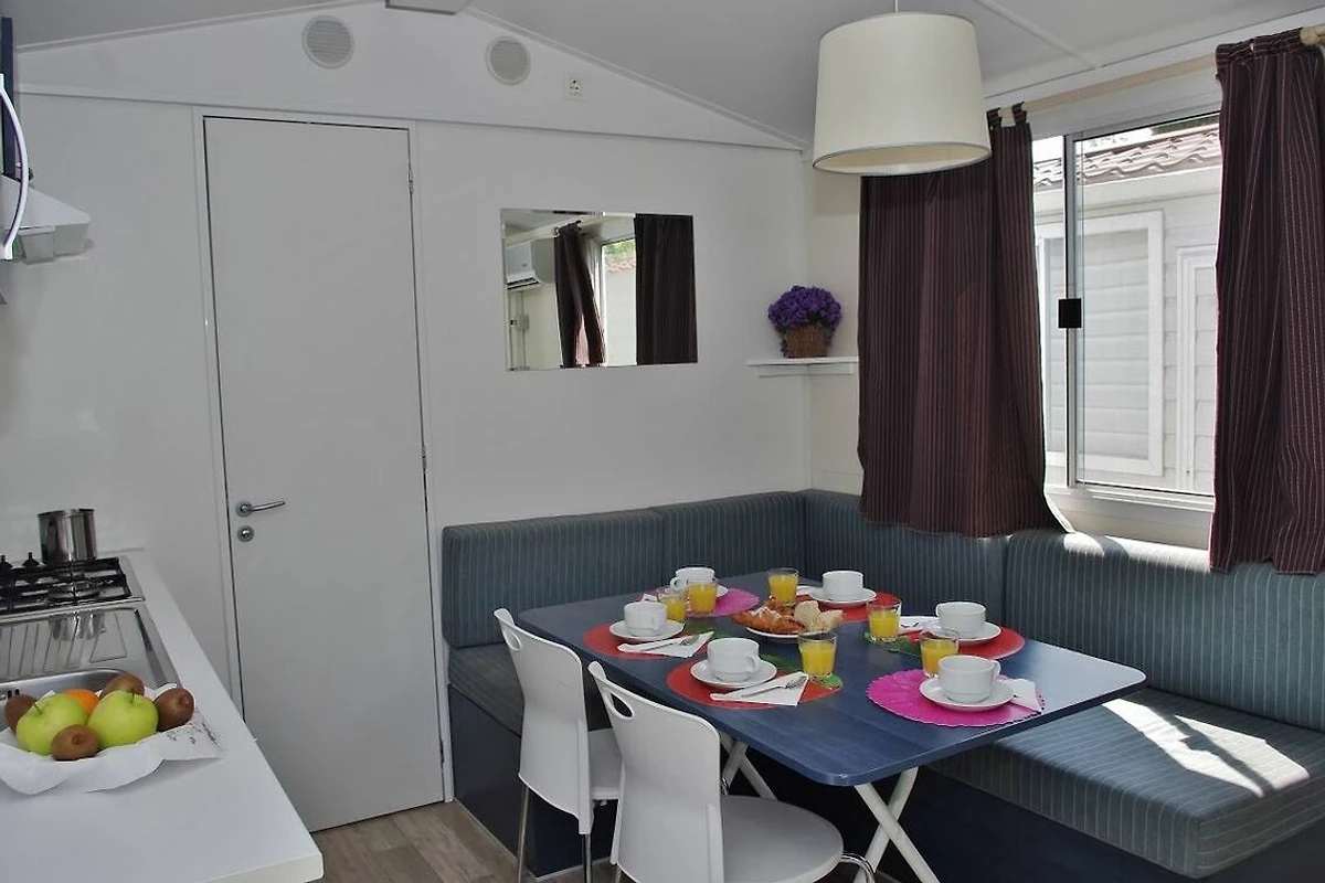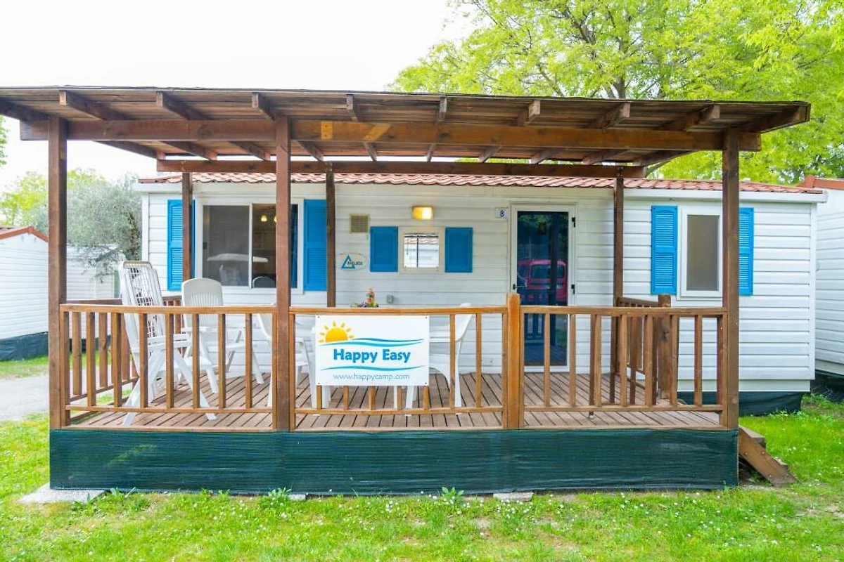 Das Mobilehome Happy Standard bietet Platz für max. 6 Personen (davon ein Kind bis max. 12 Jahre/60kg). Die Unterkunft besteht aus einem Elternschlafzimmer mit Doppelbett sowie einem Kinderzimmer mit zwei Einzelbetten und einem Hochbett. Eine weitere Schlafgelegenheit bietet das Bettsofa im Wohnzimmer. An allen Schlafzimmerfenstern befinden sich Moskitonetze. Die gut eingerichtete Küche befindet sich im Wohnbereich und verfügt über einen 4-Flammen-Gasherd, Spüle, Besteck, Geschirr, italienische Espressokanne, Töpfe sowie einen Kühlschrank mit Eisfach. Das Badezimmer ist mit einer Dusche, einem Waschbecken und einem WC ausgestattet. Die gemütliche, halbüberdachte Holzterrasse mit Tisch, Stühlen und zwei Liegen lädt zum gemütlichen Entspannen ein, während die Kinder sich auf dem Spielplatz oder am Pool austoben können. Eine Klimaanlage und eine elektrische Grillplatte sind vorhanden. Auf Wunsch kann vor Ort auch Halb- oder Vollpension dazu gebucht werden. Hinweis: Wenn Sie mehr als eine Unterkunft benötigen, ist dies bei uns in der Regel möglich, da wir über mehrere Objekte des gleichen Haustyps verfügen.