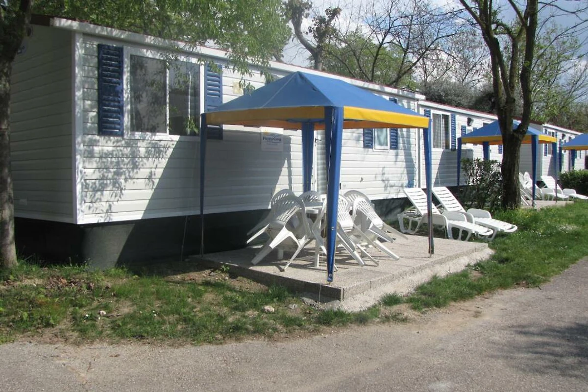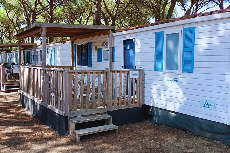 Das Mobilehome Happy Easy bietet Platz für max. 6 Personen (davon ein Kind bis max. 12 Jahre/60kg). Die Unterkunft verfügt über ein Schlafzimmer mit einem Doppelbett sowie über ein Kinderzimmer mit zwei Einzelbetten und einem quer darüber liegenden Hochbett. Eine weitere Schlafgelegenheit befindet sich im Wohnbereich. Alle Schlafzimmerfenster sind mit Moskitonetzen ausgestattet. Die gut eingerichtete Küchenzeile befindet sich im Wohnbereich und verfügt über einen Gasherd, Geschirr, Besteck, Töpfe eine typisch italienische Espressokanne sowie einen Kühlschrank mit Eisfach. Das Badezimmer ist mit einer Dusche sowie einem Waschbecken und einem WC ausgestattet. Die halbüberdachte Holzterrasse mit Tisch, Stühlen, Pavillon und zwei Liegen/Liegestühlen lädt zum gemütlichen Entspannen ein, während sich die Kinder auf dem Spielplatz oder am Pool austoben können. Eine Klimaanlage ist ebenfalls vorhanden. Eine elektrische Grillplatte ist vorhanden. Hinweis: Wenn Sie mehr als eine Unterkunft benötigen, ist dies bei uns in der Regel möglich, da wir über mehrere Objekte des gleichen Haustyps verfügen.