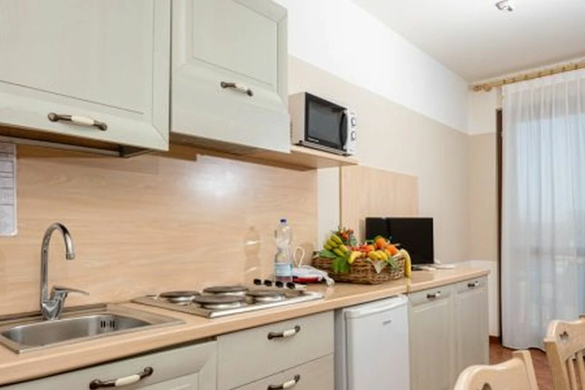Die 50 Quadratmeter grosse Wohnung Trilo bietet Platz für max. 6 Personen (inkl. Babys). Die Unterkunft verfügt über ein Schlafzimmer, welches mit einem Doppelbett ausgestattet ist wie ein Kinderzimmer welches über zwei Einzelbetten verfügt. Bei Bedarf bietet die Doppelbettcouch im kombinierten Wohn- und Essbereich noch zwei weitere Schlafmöglichkeiten. Die gut eingerichtete Küchenzeile im Wohnbereich verfügt über einen Herd, Geschirr, Besteck, Töpfe, Mikrowelle, Toaster und einen Kühlschrank mit Eisfach. Das Badezimmer ist mit einer Dusche, einem Waschbecken, einem WC und einem Bidet ausgestattet. Je nach Zuteilung befindet sich die Unterkunft im Erdgeschoss oder im ersten Stock und verfügt daher über einen möblierten Balkon oder eine Terrasse, welche beide zum gemeinsamen Entspannen und Verweilen einladen. Der ideale Ort also um gemeinsam mit der Familie einen erlebnisreichen Tag ausklingen zu lassen. Familien mit kleinen Kindern haben ausserdem noch die Möglichkeit vor Ort ein Babybett und einen Hochstuhl auszuleihen (bitte beim Buchen reservieren). Fahrzeit ab ital. Grenze beträgt etwa 1.5 Stunden. Hinweis: Wenn Sie mehr als eine Unterkunft benötigen, ist dies bei uns in der Regel möglich, da wir über mehrere Objekte des gleichen Haustyps verfügen.