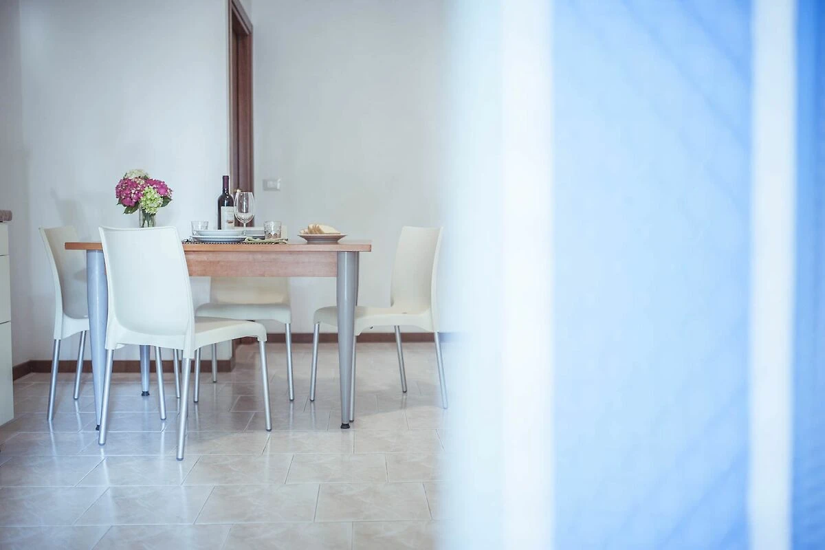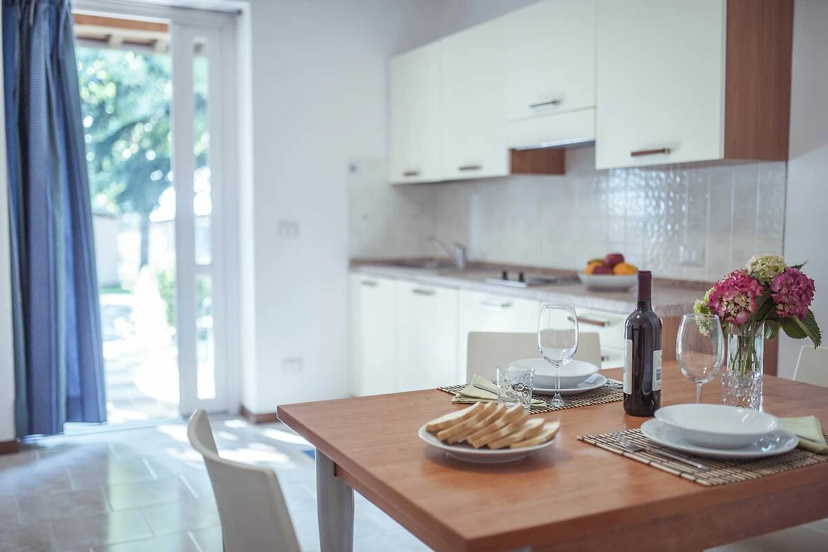 Der helle und freundlich eingerichtete Bungalow 4H-A3 bietet Platz für max. 4 Personen. Die Unterkunft besteht aus zwei Schlafzimmern mit jeweils einem Doppelbett und 2 Einzelbetten. Im Wohnbereich befindet sich die gut eingerichtete Küche mit Geschirr, Besteck, Töpfen, einem elektrischen Herd mit 2 Herdplatten, einer italienischen Espressokanne sowie einem Kühlschrank mit Eisfach. Das Badezimmer verfügt über eine Dusche, ein WC, ein Bidet und ein Waschbecken. Der überdachte Sitzplatz mit Tisch und Stühlen und der kleine Garten laden zum gemütlichen Entspannen ein, während sich die Kinder auf dem Spielplatz oder am Pool austoben können. Die Fahrzeit ab der ital. Grenze beträgt ca. 2h. Hinweis: Wenn Sie mehr als eine Unterkunft benötigen, ist dies bei uns in der Regel möglich, da wir über mehrere Objekte des gleichen Haustyps verfügen.