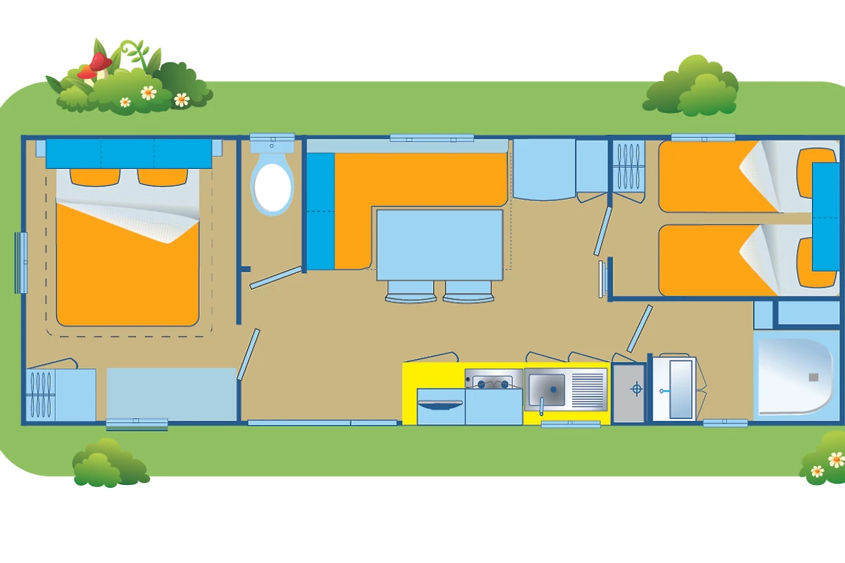 Das moderne und helle Happy Comfort Mobilhome bietet Platz für bis zu 5 Personen. Diese neuen Mobilheime besitzen eine moderne, gut eingerichtete Küchenzeile mit vielen Fächern, Kühlschrank, 4-Flammen-Gasherd und Spüle mit Abtropffläche. Auch eine italienische Espressokanne ist vorhanden. Der Wohnraum ist mit einer Schlafcouch für eine Person ausgestattet. Ein Schlafzimmer verfügt über ein Doppelbett, ein Schlafzimmer hat zwei Einzelbetten. Bad mit Waschbecken, Dusche/WC (in einigen Mobilheimen ist das WC getrennt vom Bad). Die gemütliche, erhöhte Holzterrasse ist halbüberdacht und ist mit Tisch, Stühlen, 2 Liegen und einer elektrischen Grillplatte ausgestattet und lädt zum Entspannen ein, während die Kinder sich auf dem Spielplatz austoben. Auf Wunsch kann vor Ort Halb- oder Vollpension dazu gebucht werden. Hinweis Wenn Sie mehr als eine Unterkunft benötigen, ist dies bei uns in der Regel möglich, da wir über mehrere Objekte des gleichen Haustyps verfügen.