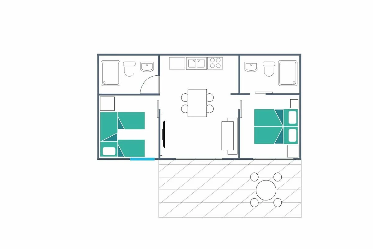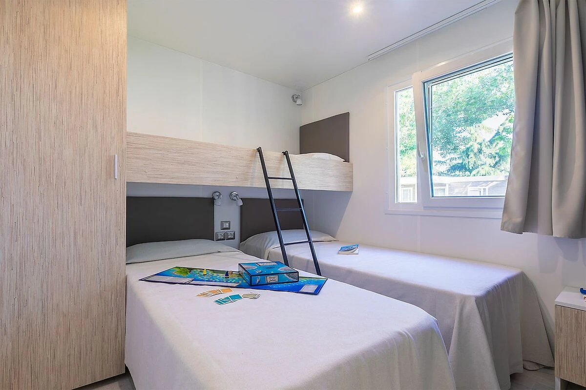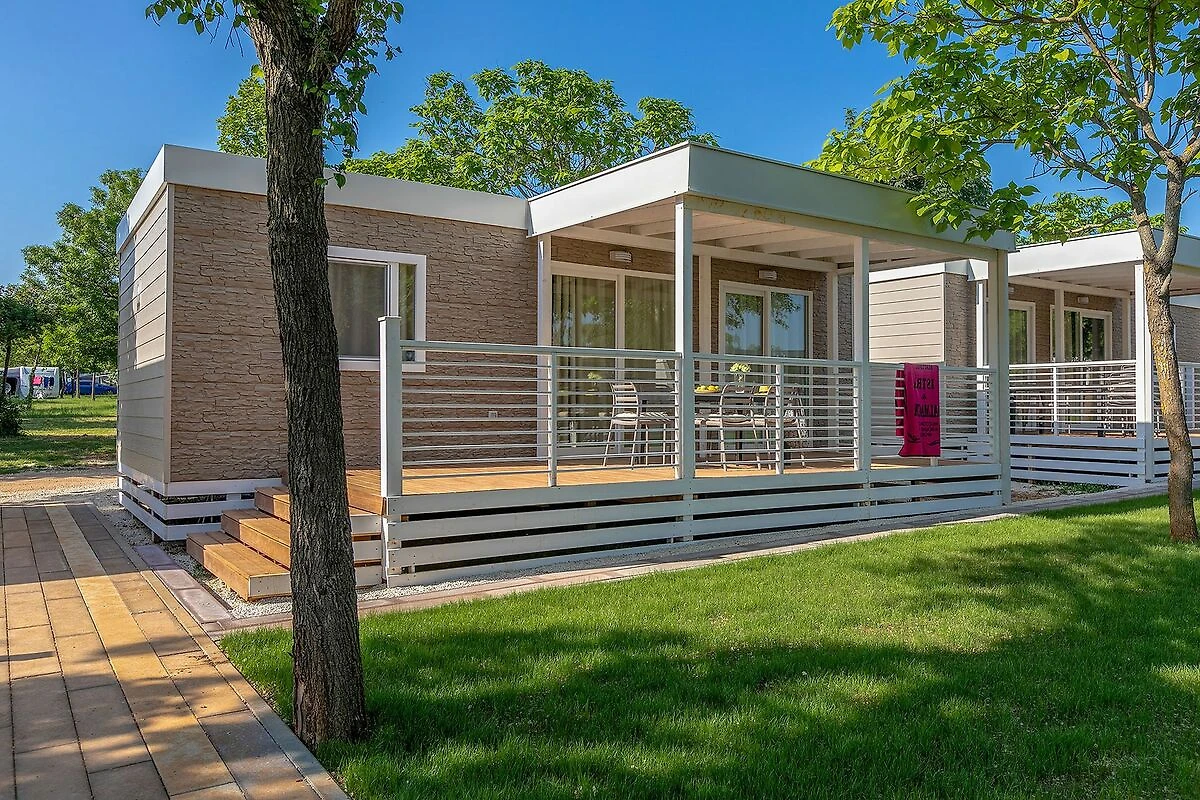 Die Lodge Premium bietet Platz für max. 5 Personen (davon mind. 1 Kind unter 12 Jahren). Die Unterkunft besteht aus einem Schlafzimmer mit Ehebett und einem Schlafzimmer mit einem Stockbett und zwei Einzelbetten. Im Wohnbereich befindet sich ausserdem die gut eingerichtete Küche mit Geschirr, Besteck, Töpfen, Mikrowelle, Espressokanne, Kühlschrank mit Eisfach und einem Herd. Die Unterkunft verfügt über zwei Badezimmer mit jeweils einem WC, einer Dusche, einem Waschbecken und einem Haartrockner. Die überdachte Terrasse mit Tisch und Stühlen lädt zum gemütlichen Entspannen ein, während die Kinder sich auf dem Spielplatz oder am Pool austoben können. Grillen ist mit einem Gas- oder Elektrogrill erlaubt. Fahrzeit ab kroatischer Grenze ca. 5.5h. Hinweis: Wenn Sie mehr als eine Unterkunft benötigen, ist dies bei uns in der Regel möglich, da wir über mehrere Objekte des gleichen Haustyps verfügen.
