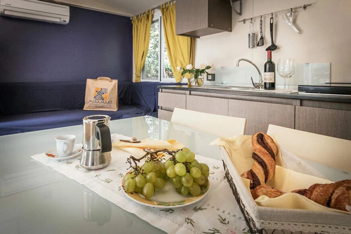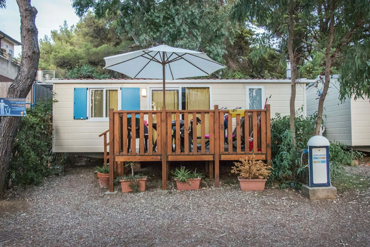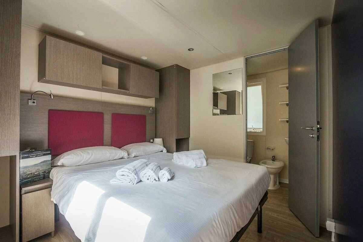 Das moderne Mobilehome bietet Platz für bis zu 5 Personen und verfügt über ein Schlafzimmer mit Doppelbett sowie ein Kinderzimmer mit zwei Einzelbetten. Das Schlafsofa im Wohnbereich bietet eine zusätzliche Schlafgelegenheit. Zu jedem Schlafzimmer gehört ein eigenes Badezimmer, das mit einer Duschkabine, einem Waschbecken, einer Toilette und einem Bidet ausgestattet ist. Die gut eingerichtete Küchenzeile im Wohnbereich verfügt über einen Gasherd, Geschirr, Besteck, Töpfe, italienische Kaffeekanne und einen Kühlschrank mit Eisfach. Eine Klimaanlage und SAT-TV sind vorhanden. Eine nicht überdachte Holzterrasse mit Tisch, Stühlen, Sonnenschirm und Liegestuhl lädt zum Verweilen im Freien ein, während die Kinder sich auf dem Spielplatz oder am Pool austoben können. Grillen ist am Grillplatz erlaubt. Fahrzeit ab ital. Grenze ca. 3h. Hinweis: Wenn Sie mehr als eine Unterkunft benötigen, ist dies bei uns in der Regel möglich, da wir über mehrere Objekte des gleichen Haustyps verfügen.