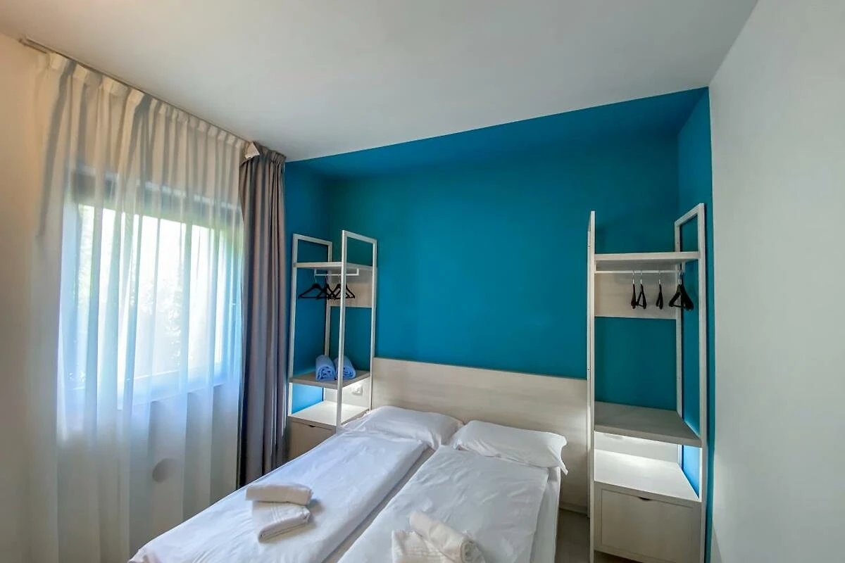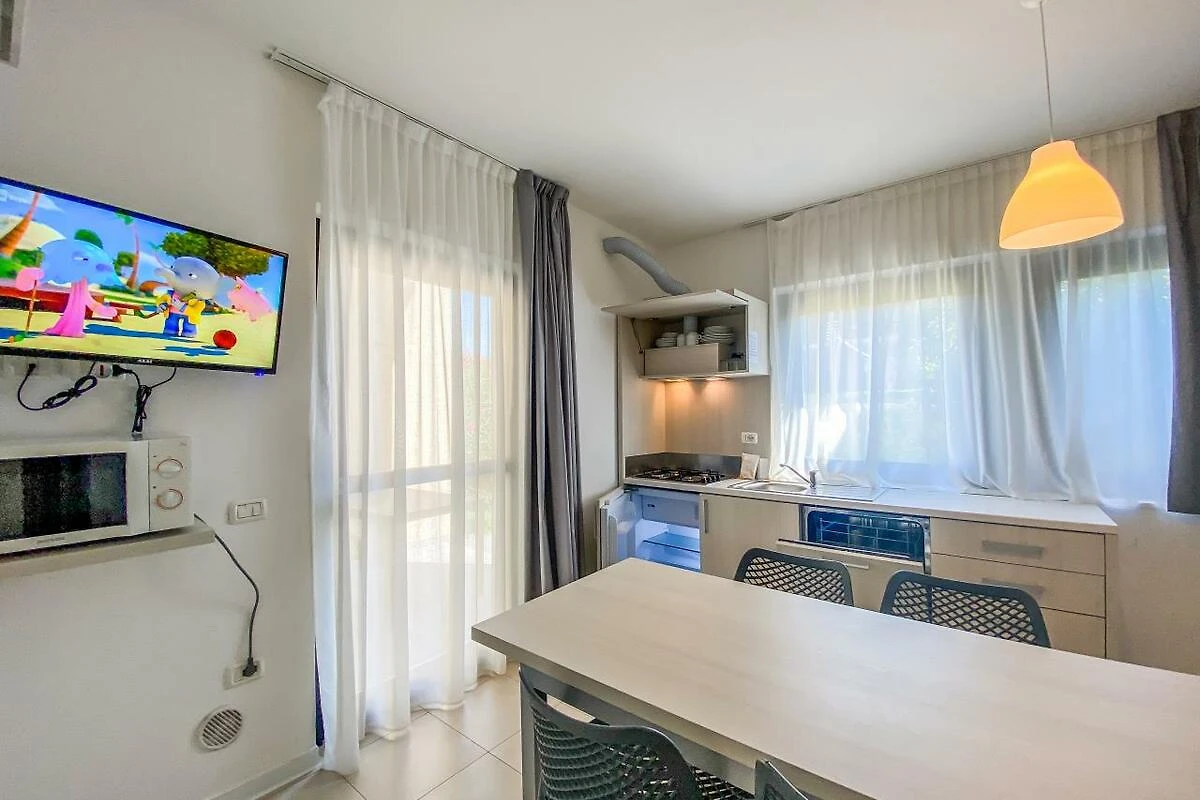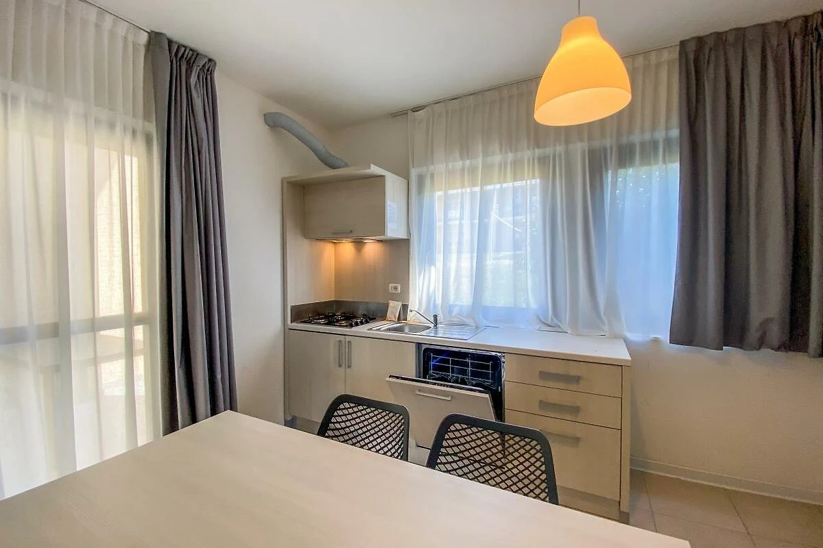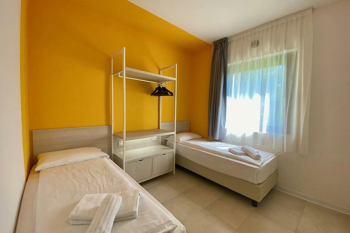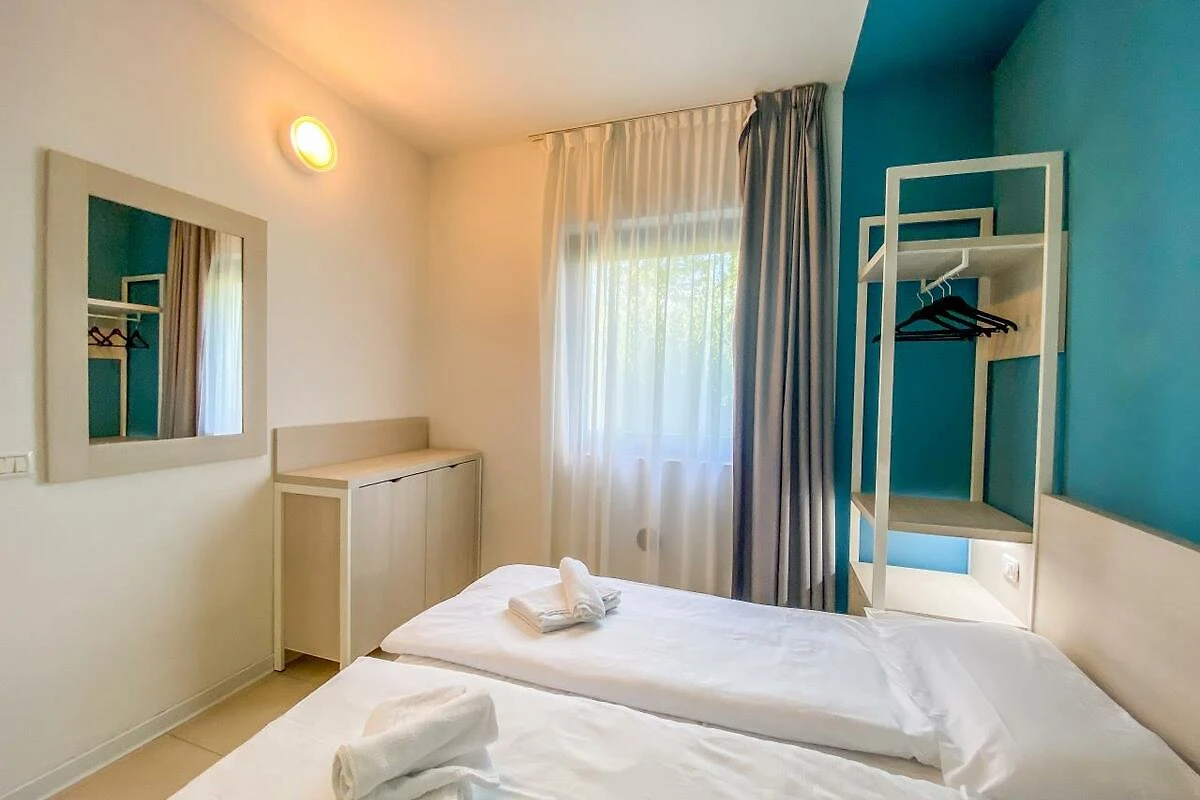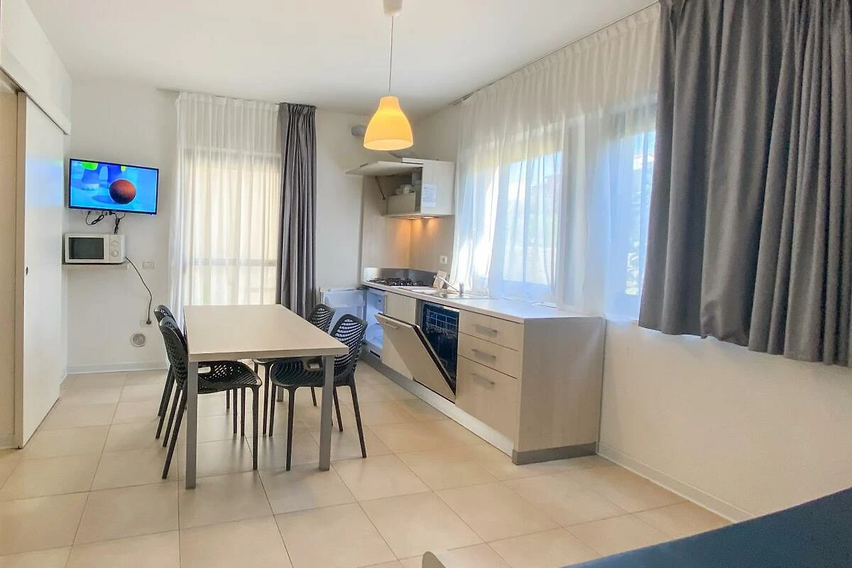 Die Wohnung Easy befindet sich im Obergeschoss und bietet Platz für max. 4 Personen. Sie verfügt über ein Schlafzimmer mit einem Doppelbett sowie einem Kinderzimmer mit zwei Einzelbetten. Die Wohnung besteht zudem aus einem Wohnraum mit einer gut eingerichteten Kochecke, welche über einen Herd, Geschirr, Besteck, Kochtöpfe, Mikrowelle sowie Kühlschrank mit Eisfach verfügt. Das Badezimmer verfügt über eine Dusche, WC, Waschbecken sowie ein Bidet. Der Balkon mit Tisch und Stühlen lädt zum gemütlichen Entspannen ein, während die Kinder sich auf dem Spielplatz oder am Pool austoben können. Hinweis: Wenn Sie mehr als eine Unterkunft benötigen, ist dies bei uns in der Regel möglich, da wir über mehrere Objekte des gleichen Haustyps verfügen.