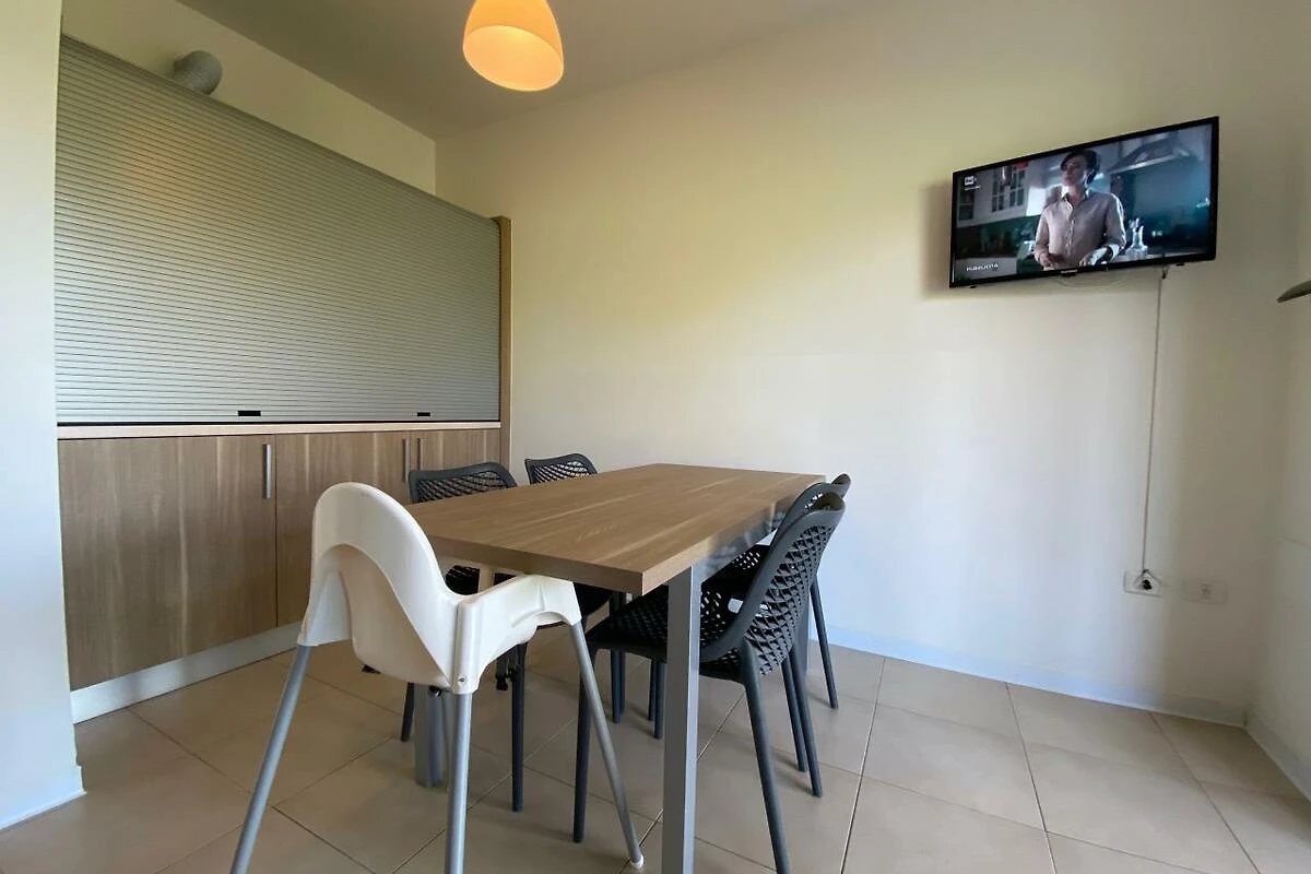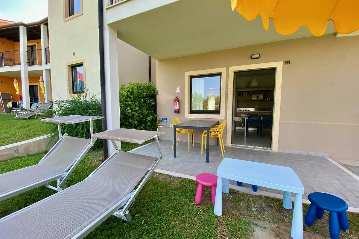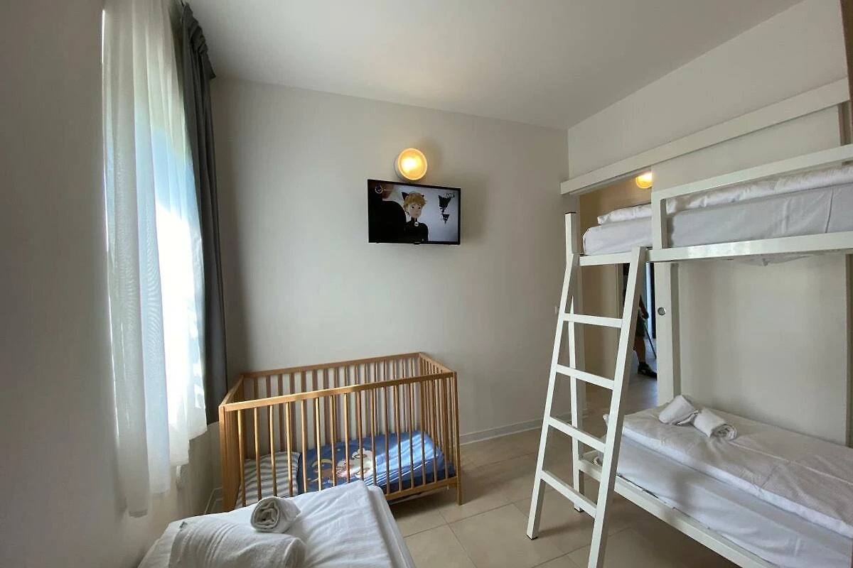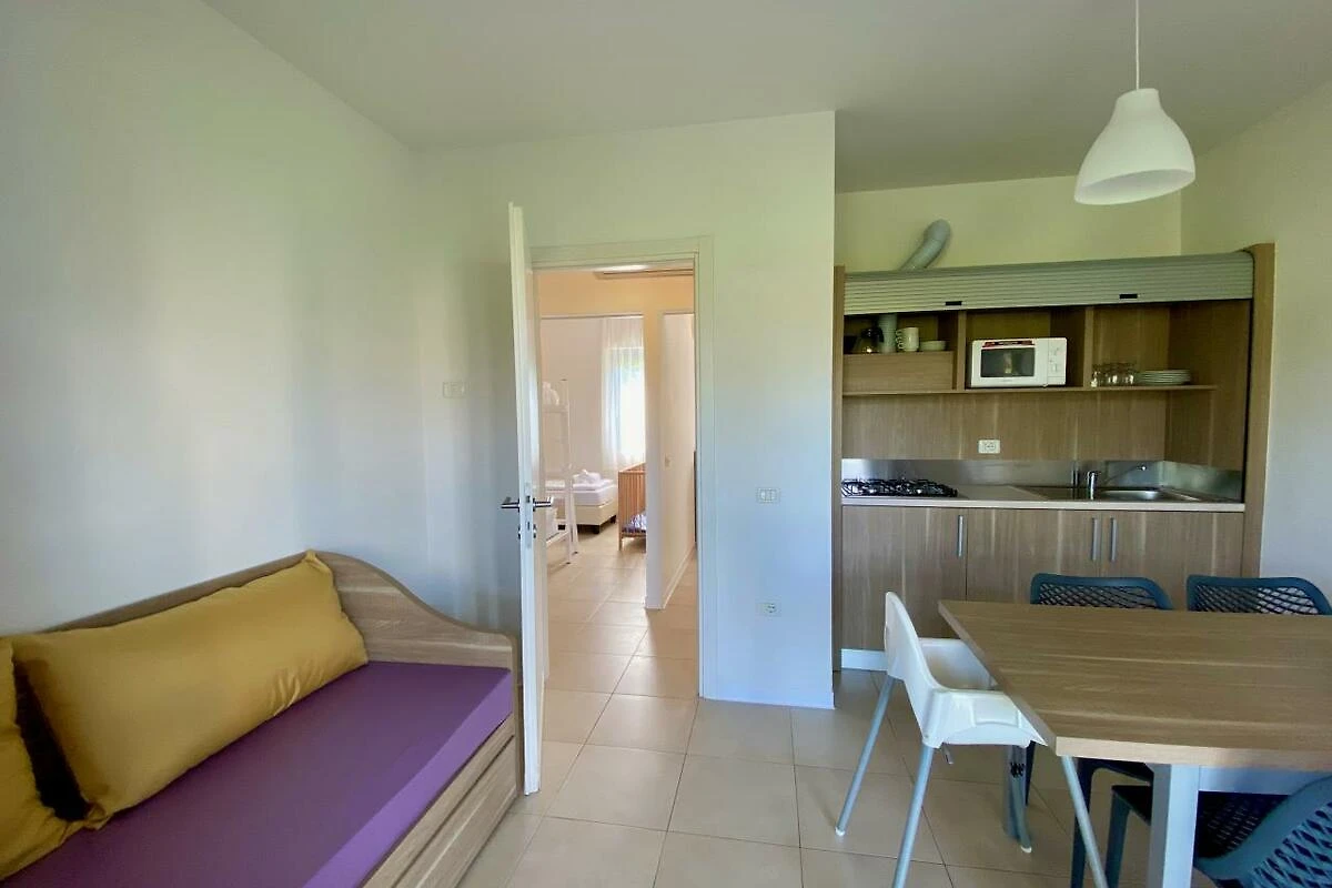 Die Wohnung Family befindet sich im Erdgeschoss in der Nähe der Spielplätze und bietet Platz für max. 6 Personen (Überbelegung mit einem Baby bis max. 2 Jahren möglich). Sie verfügt über ein Schlafzimmer mit einem Doppelbett sowie einem Kinderzimmer mit einem Einzelbett und einem Stockbett. Die Wohnung besteht zudem aus einem kombinierten Wohn- und Schlafraum mit einem Bettsofa zum ausklappen. Es hat eine gut eingerichtete Küchenecke, welche über einen Herd, Geschirr, Besteck, Kochtöpfe, Mikrowelle sowie Kühlschrank mit Eisfach verfügt. Das Badezimmer verfügt über eine Dusche, WC, Waschbecken sowie ein Bidet. Die Terrasse mit Tisch, Stühlen, Sonnenschirm sowie nettem Spieltisch mit Kinderstühlen lädt zum gemütlichen Entspannen ein, während die Kinder sich auf dem Spielplatz, am Kinderspieltisch oder am Pool austoben können. Da diese Wohnungen genau auf Familien mit kleinen Kindern abgestimmt sind, ist ein «Early Check-in» ab 12.00 Uhr für die Familien möglich. Hinweis: Wenn Sie mehr als eine Unterkunft benötigen, ist dies bei uns in der Regel möglich, da wir über mehrere Objekte des gleichen Haustyps verfügen.