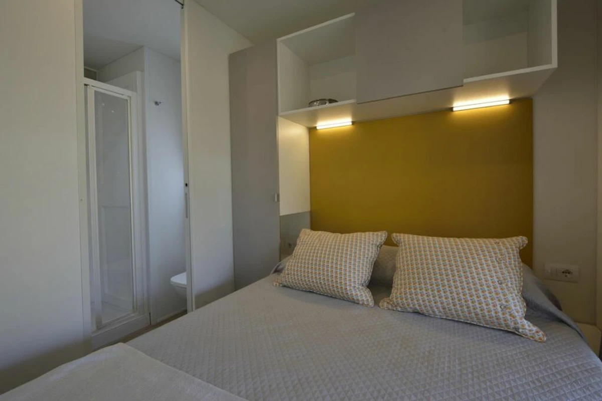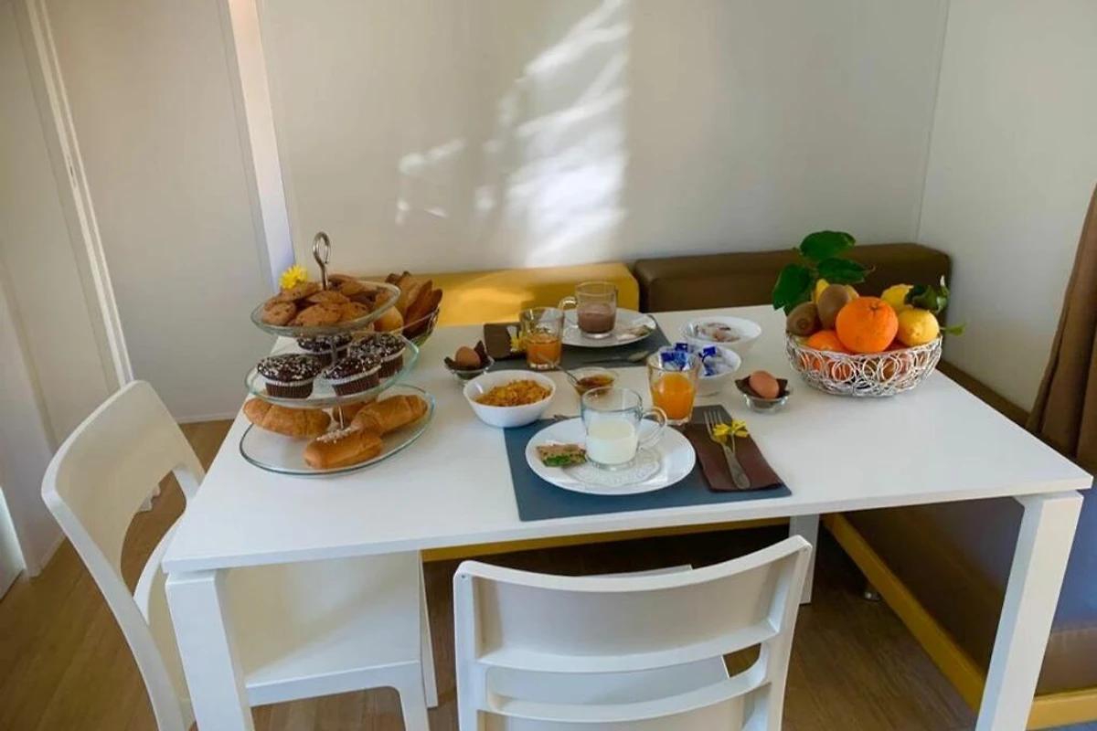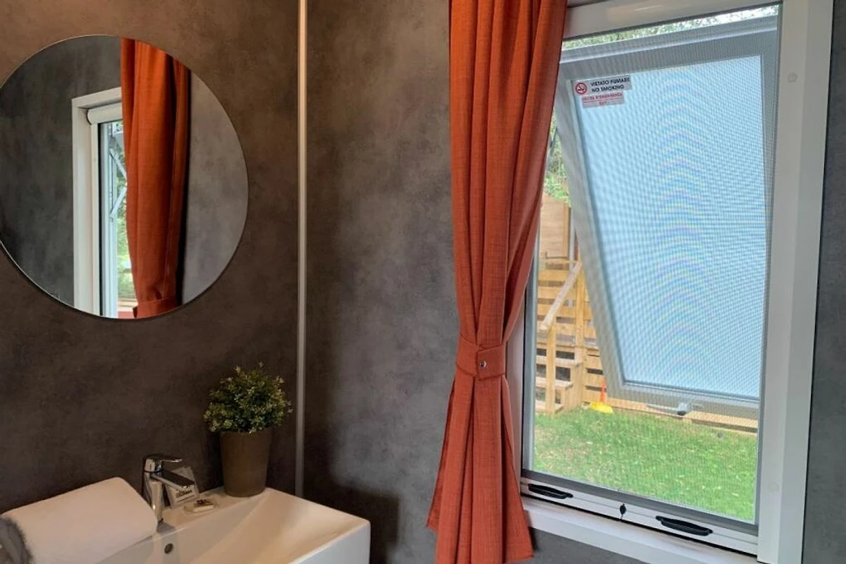 Das schöne Mobilehome Piazzetta Family bietet Platz für 6 Personen. Es verfügt über ein Schlafzimmer mit einem Doppelbett und einem angeschlossenen Badezimmer mit einer Dusche, einem Waschbecken und einem WC. Zwei weitere Schlafzimmer verfügen über je 2 Einzelbetten. Zudem hat die Unterkunft einen kombinierten Ess- und Wohnbereich, wo man auch die gut ausgestattete Kochnische mit Elektroherd, einen Kühlschrank mit Eisfach, Spüle, Besteck, Geschirr, Töpfen, Pfannen und einer Filterkaffeemaschine findet. Es hat ein weiteres Badezimmer mit einer Dusche, einem Waschbecken und einem WC. Eine überdachte Holzveranda mit Tisch und Stühlen, die zum Essen und Verweilen im Freien einlädt, ist auch vorhanden. Bei Bedarf kann ein Gasgrill vor Ort gemietet werden (Elektro- und Kohlegrill sind nicht erlaubt). Fahrzeit ab ital. Grenze ca. 2h. Hinweis: Wenn Sie mehr als eine Unterkunft benötigen, ist dies bei uns in der Regel möglich, da wir über mehrere Objekte des gleichen Wohnungstyps verfügen.