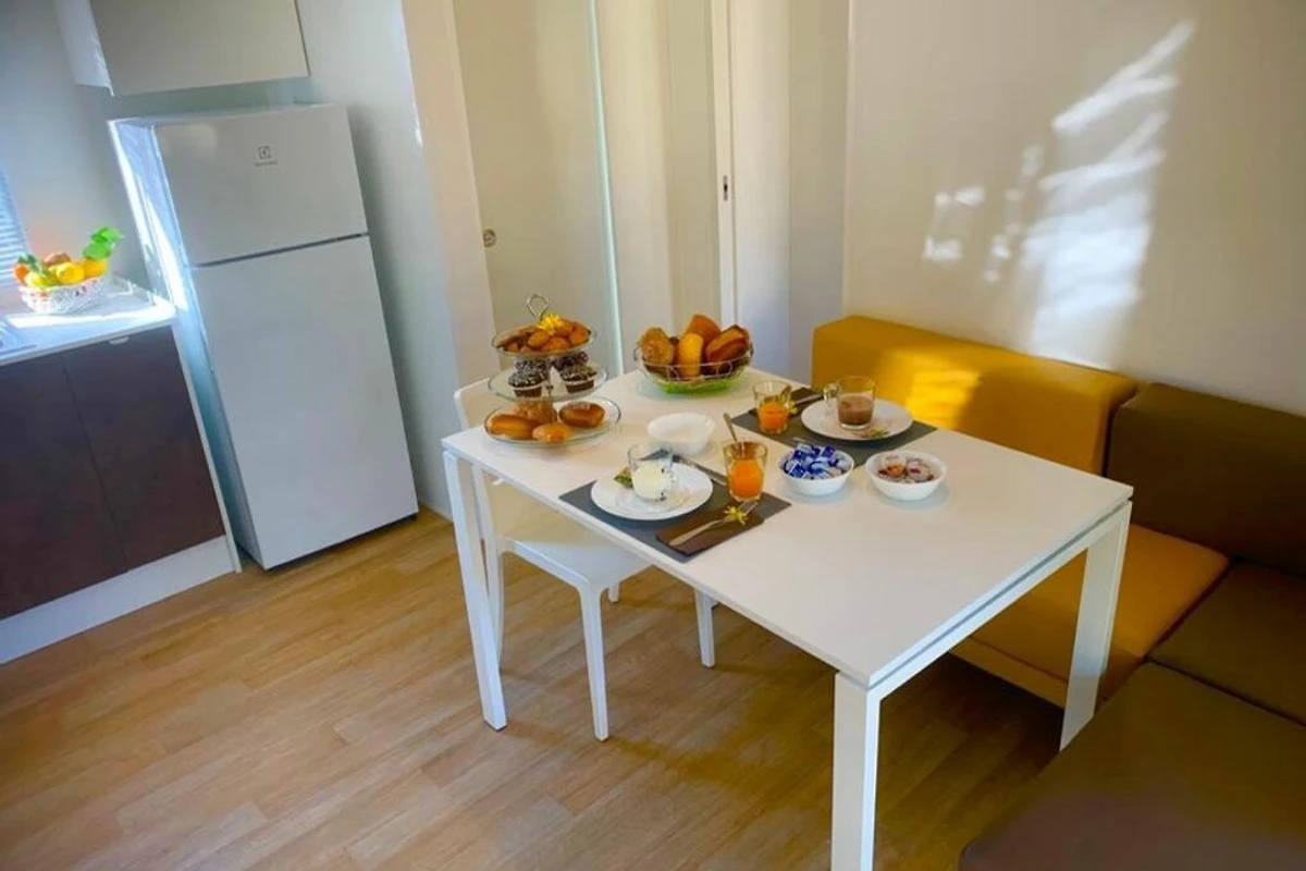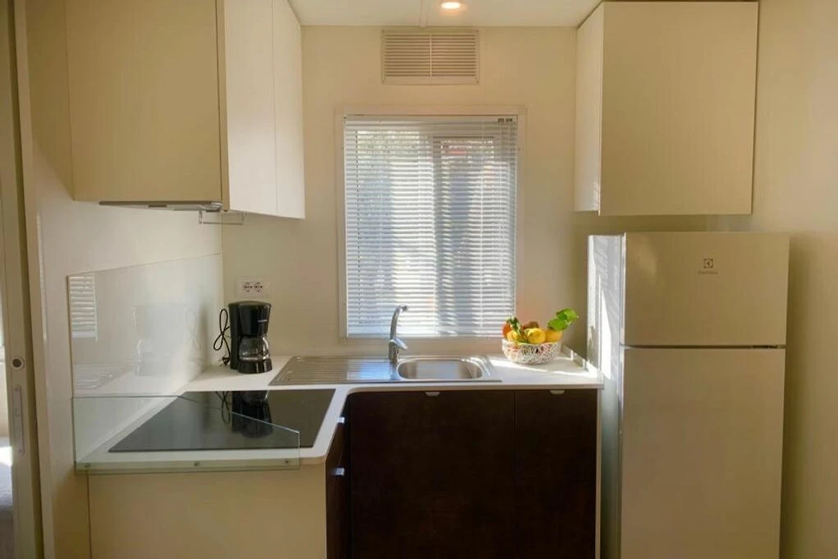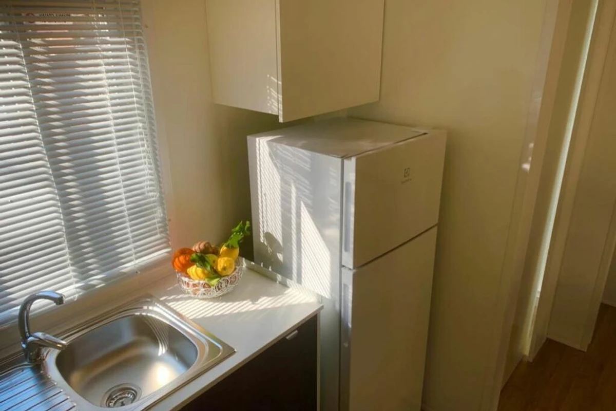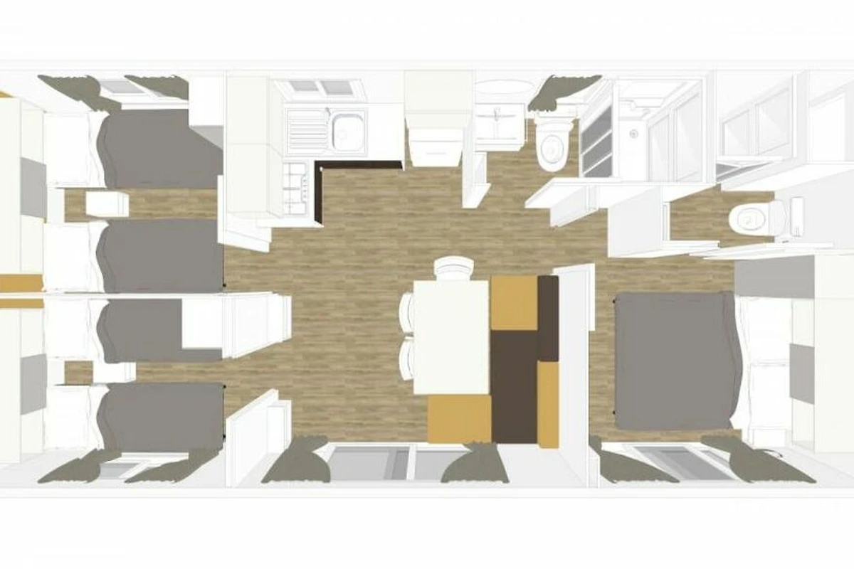 Das schöne Mobilehome Piazzetta Family bietet Platz für 6 Personen. Es verfügt über ein Schlafzimmer mit einem Doppelbett und einem angeschlossenen Badezimmer mit einer Dusche, einem Waschbecken und einem WC. Zwei weitere Schlafzimmer verfügen über je 2 Einzelbetten. Zudem hat die Unterkunft einen kombinierten Ess- und Wohnbereich, wo man auch die gut ausgestattete Kochnische mit Elektroherd, einen Kühlschrank mit Eisfach, Spüle, Besteck, Geschirr, Töpfen, Pfannen und einer Filterkaffeemaschine findet. Es hat ein weiteres Badezimmer mit einer Dusche, einem Waschbecken und einem WC. Eine überdachte Holzveranda mit Tisch und Stühlen, die zum Essen und Verweilen im Freien einlädt, ist auch vorhanden. Bei Bedarf kann ein Gasgrill vor Ort gemietet werden (Elektro- und Kohlegrill sind nicht erlaubt). Fahrzeit ab ital. Grenze ca. 2h. Hinweis: Wenn Sie mehr als eine Unterkunft benötigen, ist dies bei uns in der Regel möglich, da wir über mehrere Objekte des gleichen Wohnungstyps verfügen.