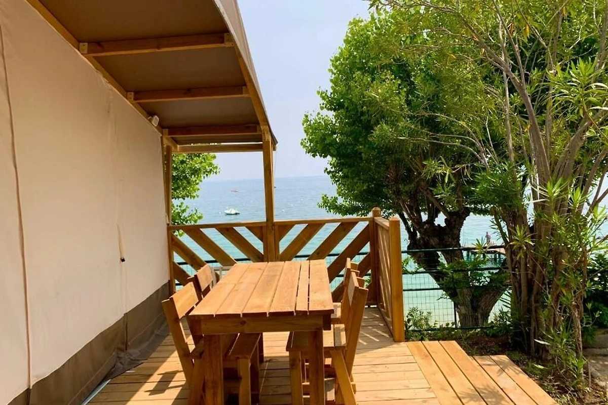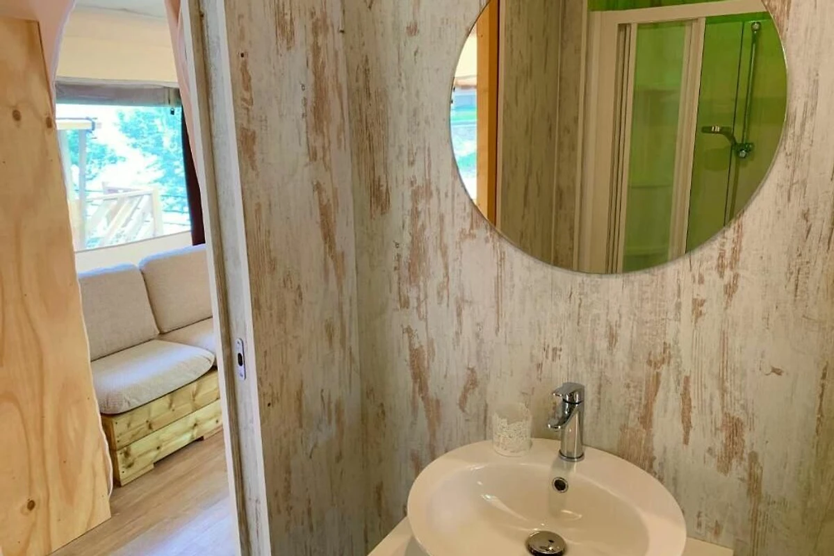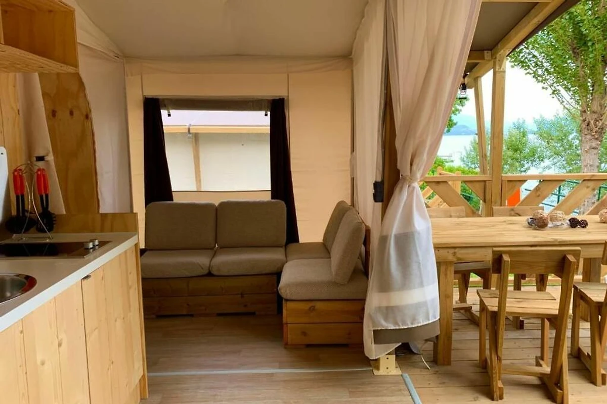 Das naturverbundene Safari Zelt bietet Platz für 5 Personen. Es verfügt über ein Schlafzimmer mit einem Doppelbett. Das zweite Schlafzimmer verfügt über ein Einzelbett und ein Stockbett. Zudem hat die Unterkunft einen kombinierten Ess- und Wohnbereich, wo man auch eine ausgestattete Kochnische mit Elektroherd (2 Platten), einen Kühlschrank mit Eisfach, Spüle, Besteck, Geschirr, Töpfe und Pfannen findet. Das Badzimmer mit Dusche, Waschbecken und WC ist von beiden Schlafzimmern aus zugänglich. Eine Holzveranda mit Tisch und Stühlen, die zum Essen und Verweilen im Freien einlädt, ist auch vorhanden. Bei Bedarf kann ein Gasgrill vor Ort gemietet werden (Elektro- und Kohlegrill sind nicht erlaubt). Fahrzeit ab ital. Grenze ca. 2h. Hinweis: Wenn Sie mehr als eine Unterkunft benötigen, ist dies bei uns in der Regel möglich, da wir über mehrere Objekte des gleichen Wohnungstyps verfügen.