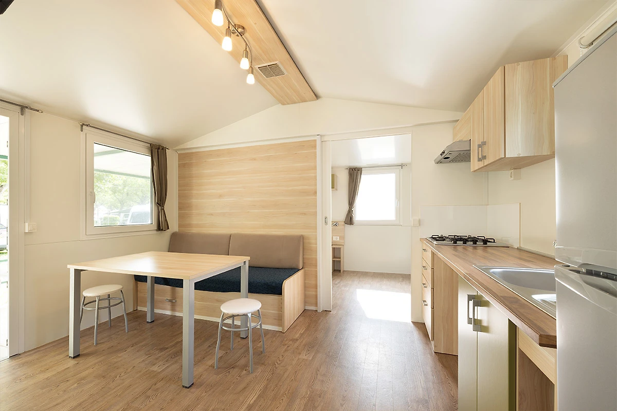 Das behindertengerechte Mobilehome Tirreno Disabili bietet Platz für max. 6 Personen (davon mindestens 1 Kind bis 12 Jahre). Die Unterkunft verfügt über ein Schlafzimmer mit einem Doppelbett sowie über ein Kinderzimmer mit zwei Einzelbetten. Bei Bedarf bietet das Schlafsofa im kombinierten Wohn- und Essbereich noch Schlafmöglichkeiten für einen Erwachsenen und ein Kind. Die zweckmässig eingerichtete Küchenzeile im Wohnbereich ist mit einem Gasherd, Geschirr, Besteck, Töpfen, einer typisch italienischen Espressokanne und einem Kühlschrank mit Eisfach ausgestattet. In der Unterkunft gibt es ein behindertengerecht ausgestattetes Badezimmer mit einem Waschbecken, einem WC und einer Dusche. Der überdachte Sitzplatz mit Tisch und Stühlen lädt zum gemütlichen Entspannen und Verweilen ein, während sich die Kinder auf dem Spielplatz oder am Pool austoben und neue Freundschaften mit Kindern aus aller Welt schliessen können. SAT-TV ist vorhanden. Grillen ist ebenfalls erlaubt. Fahrzeit ab ital. Grenze ca. 3h. Hinweis: Wenn Sie mehr als eine Unterkunft benötigen, ist dies bei uns in der Regel möglich, da wir über mehrere Objekte des gleichen Haustyps verfügen.