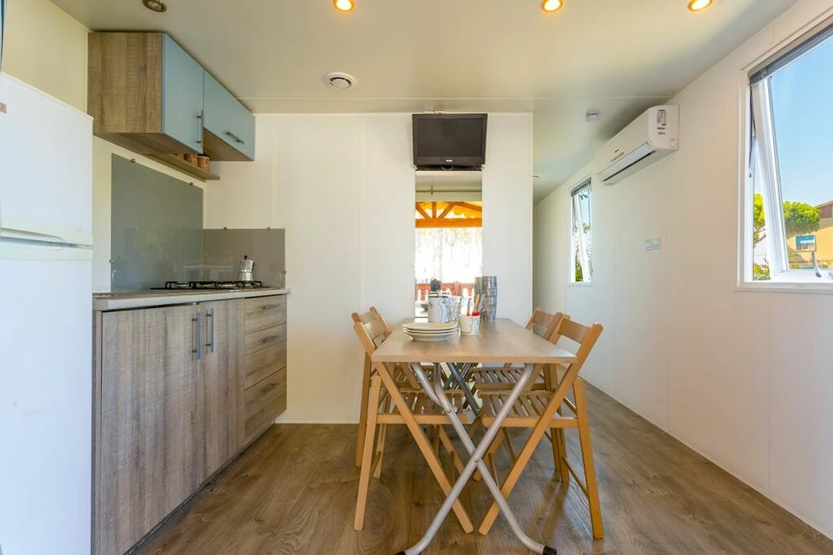 Die Unterkunft Baia Classic bietet Platz für max. 4 Personen und besteht aus einem Schlafzimmer mit einem Doppelbett sowie einem zweiten Zimmer mit zwei Einzelbetten. Im Wohnbereich hat es ein Sofa und einen TV. Die gut eingerichtete Küche befindet sich ebenfalls im Wohnbereich und verfügt über Geschirr, Besteck, Töpfe, Pfannen, italienische Espressokanne sowie Kühlschrank mit Eisfach. Das Badezimmer verfügt über eine Dusche sowie Waschbecken und WC. Die überdachte und erhöhte Holzveranda mit Tisch und Stühlen lädt zum gemütlichen Entspannen ein, während die Kinder sich auf dem Spielplatz oder am Pool austoben können. Grillen ist erlaubt elektrisch oder mit Gas, ein Grill ist selbst mitzubringen. Hinweis: Wenn Sie mehr als eine Unterkunft benötigen, ist dies bei uns in der Regel möglich, da wir über mehrere Objekte des gleichen Haustyps verfügen.