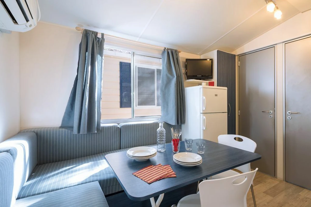 Die Unterkunft Blu Romantic bietet Platz für max. 6 Personen (davon mind. 2 Kinder bis max. 11.99 Jahre) und besteht aus einem Schlafzimmer mit Doppelbett, sowie einem zweiten Zimmer mit zwei Einzelbetten und einem Hochbett (für ein Kind) quer darüber. Im Wohnbereich hat es ein Bettsofa, welches als weiterer Schlafplatz genutzt werden kann und einen TV. Die gut eingerichtete Küche befindet sich ebenfalls im Wohnbereich und verfügt über Geschirr, Besteck, Töpfe, Pfannen, italienische Espressokanne sowie Kühlschrank mit Eisfach. Das Badezimmer verfügt über eine Dusche mit Waschbecken. Das WC mit Waschbecken ist separat. Der überdachte Sitzplatz mit Tisch und Stühlen lädt zum gemütlichen Entspannen ein, während die Kinder sich auf dem Spielplatz oder am Pool austoben können. Grillen ist erlaubt elektrisch oder mit Gas, ein Grill ist selbst mitzubringen. Hinweis: Wenn Sie mehr als eine Unterkunft benötigen, ist dies bei uns in der Regel möglich, da wir über mehrere Objekte des gleichen Haustyps verfügen.