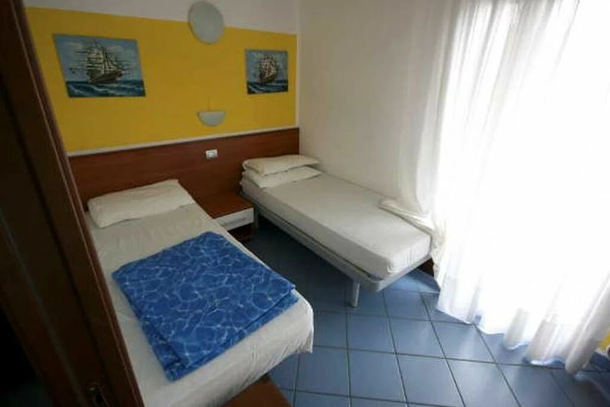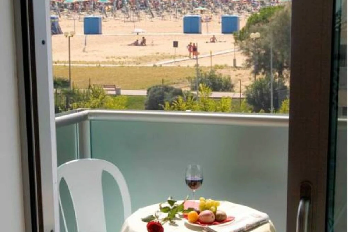 Die Wohnung mit tollem Meerblick bietet mit 29m2 Platz für max. 4 Personen. Sie verfügt über ein Schlafzimmer mit drei Einzelbetten, welches mit einer offenen Wand vom Wohnzimmer abgetrennt ist. Die Wohnung besteht zudem aus einem Wohnraum mit einem Schlafsofa und einer gut eingerichteten Kochecke, welche über einen Herd, Geschirr, Besteck, Kochtöpfe, eine Mikrowelle, einen Toaster, eine Filterkaffeemaschine, eine Spülmaschine sowie einen Kühlschrank mit Eisfach verfügt. Das Badezimmer verfügt über eine Dusche, ein WC, ein Waschbecken sowie ein Bidet und einen Haartrockner. Der Balkon mit Tisch und Stühlen lädt zum gemütlichen Entspannen ein. SAT-TV ist vorhanden. Fahrzeit ab ital. Grenze ca. 3.5h. Hinweis: Wenn Sie mehr als eine Unterkunft benötigen, ist dies bei uns in der Regel möglich, da wir über mehrere Objekte des gleichen Haustyps verfügen.