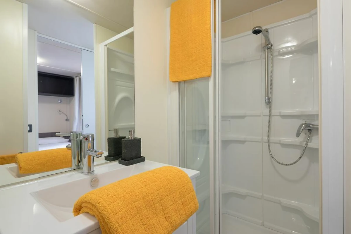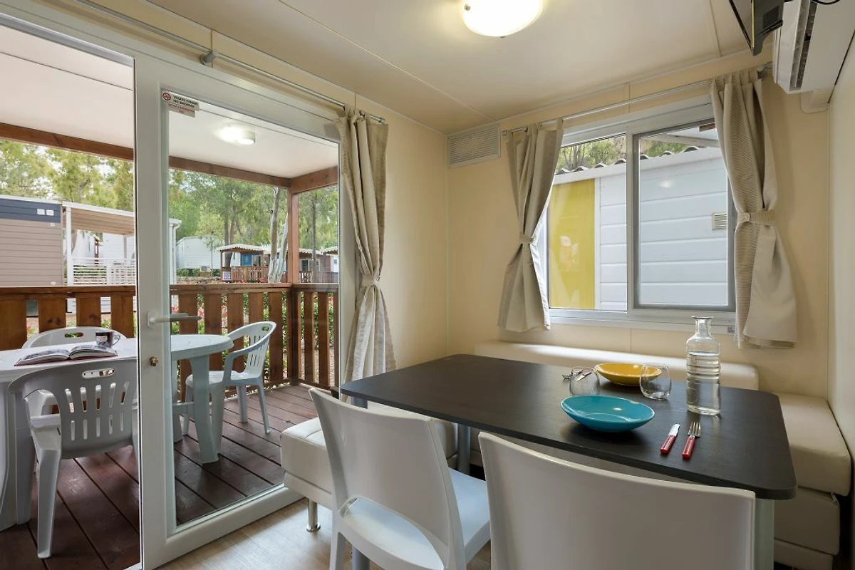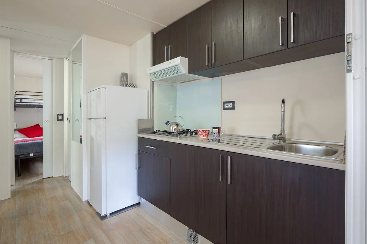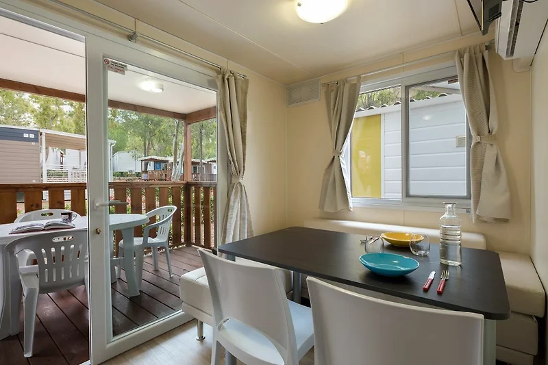 Das Mobilehome Baia Smeralda bietet Platz für max. 5 Personen. Es verfügt über ein Schlafzimmer mit einem Doppelbett und ein weiteres Zimmer mit zwei Einzelbetten und einem Hochbett quer darüber(für ein Kind). Das Wohnzimmer verfügt über eine gemütliche Essecke mit SAT-TV. Die Küche ist im Wohnraum integriert und verfügt über einen Herd, Töpfe, Geschirr, Besteck und einen Kühlschrank mit Eisfach. Das Badezimmer besteht aus einer Dusche, WC und einem Waschbecken. Zudem gibt es ein weiteres WC mit Waschbecken. Die überdachte und erhöhte Holzveranda mit Tisch und Stühlen lädt zum gemütlichen Entspannen ein, während die Kinder sich auf dem Spielplatz austoben können. Grillen ist mit einem Elektro- oder Gasgrill erlaubt, ein Grill ist selbst mitzubringen. Hinweis: Wenn Sie mehr als eine Unterkunft benötigen, ist dies bei uns in der Regel möglich, da wir über mehrere Objekte des gleichen Haustyps verfügen.