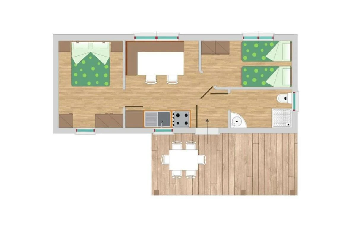 Das Mobilehome C4 bietet Platz für max. 4 Personen. Es verfügt über ein Schlafzimmer mit einem Doppelbett sowie ein Kinderzimmer mit zwei Einzelbetten. Im Wohnzimmer gibt es einen SAT-TV. Es hat eine gut eingerichtete Küchenecke, welche über einen Herd, Geschirr, Besteck, Kochtöpfe, Mikrowelle sowie Kühlschrank mit Eisfach verfügt. Das Badezimmer ist mit einer Dusche, WC und einem Waschbecken ausgestattet. Die überdachte Terrasse mit Tisch und Stühlen lädt zum gemütlichen Entspannen ein, während die Kinder sich auf dem Spielplatz oder am Pool austoben können. Fahrzeit ab italienischer Grenze ca. 4h. Hinweis: Wenn Sie mehr als eine Unterkunft benötigen, ist dies bei uns in der Regel möglich, da wir über mehrere Objekte des gleichen Haustyps verfügen.