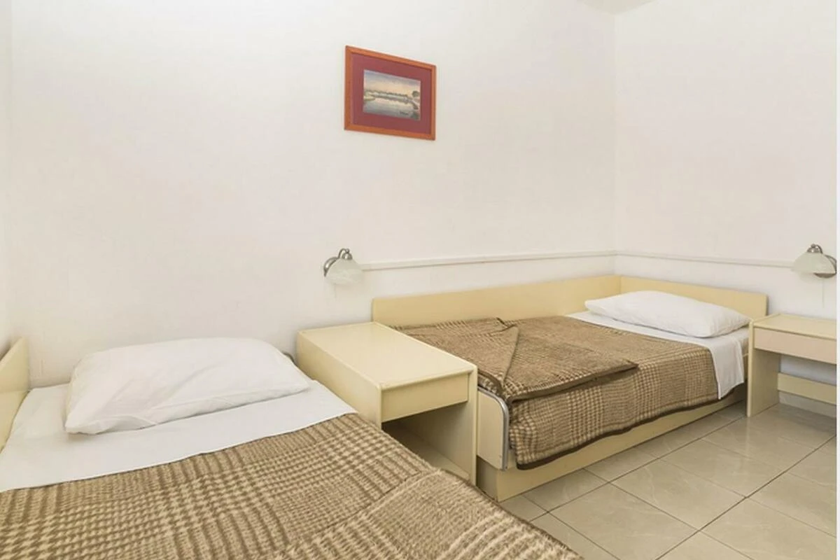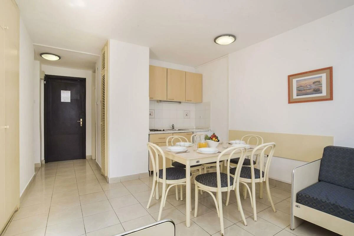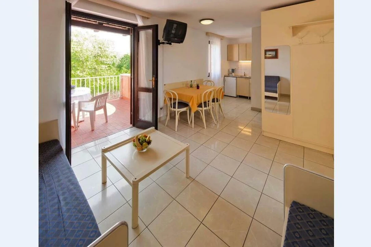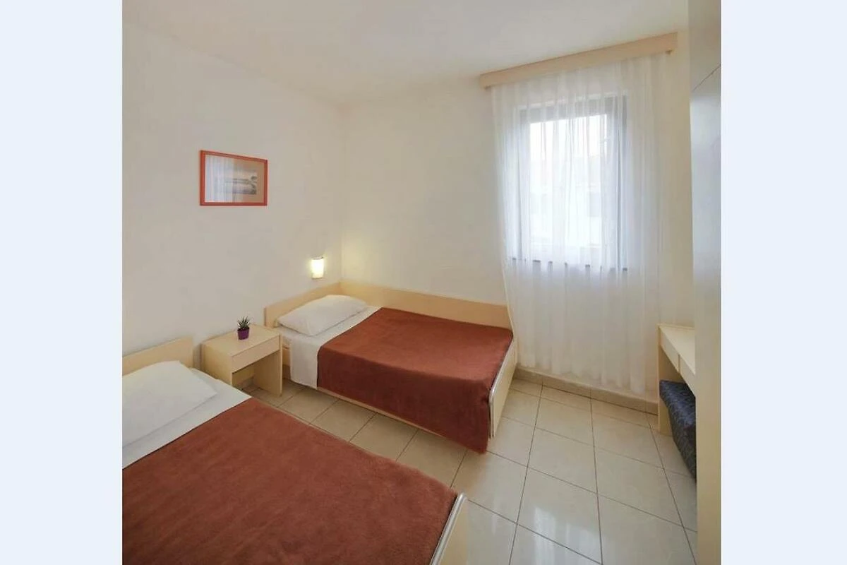 Die Wohnung bietet Platz für max. 6 Personen und liegt im Erdgeschoss oder im Obergeschoss. Die Unterkunft besteht aus einem Schlafzimmer mit Ehebett, sowie einem weiteren Zimmer mit zwei Einzelbetten. Im Wohnbereich befinden sich zwei Schlafsofas, für jeweils eine Person. Im Wohnbereich befindet sich auch eine gut eingerichtete Küche mit Geschirr, Besteck, Töpfen, einem Kochherd und einem kleinen Kühlschrank. Das Badezimmer verfügt über eine Badewanne, ein Waschbecken und ein WC. Der Balkon mit Tisch, Stühlen und einem Kamin lädt zum gemütlichen Entspannen ein, während sich die Kinder auf dem Spielplatz oder im Miniclub austoben. Grillen ist erlaubt. Die Fahrzeit ab der kroatischen Grenze beträgt ca. 45 Minuten. Hinweis: Wenn Sie mehr als eine Unterkunft benötigen, ist dies bei uns in der Regel möglich, da wir über mehrere Objekte des gleichen Haustyps verfügen.
