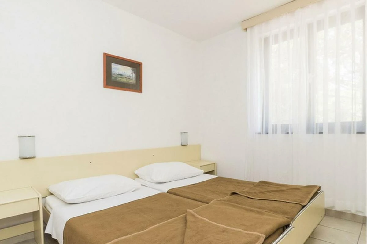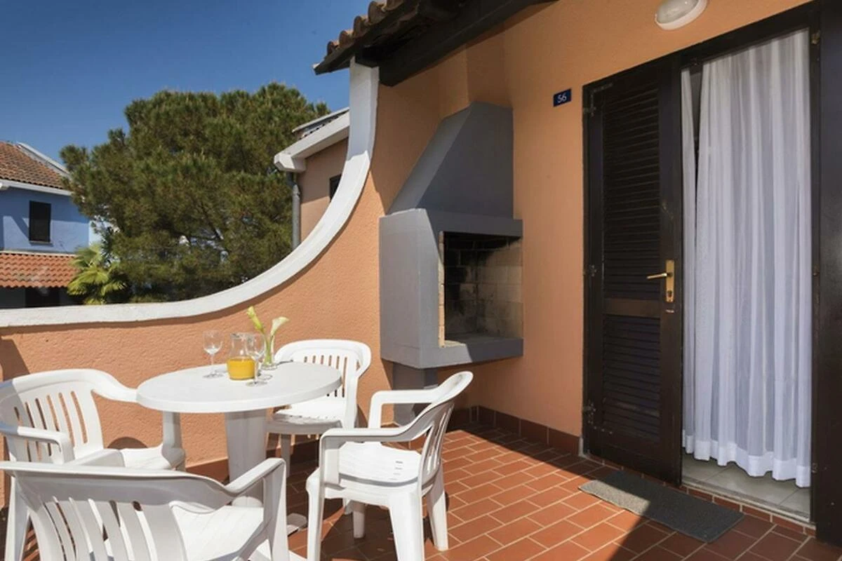Die Wohnung bietet Platz für max. 4 Personen und liegt im Erdgeschoss oder im Obergeschoss. Die Unterkunft besteht aus einem Schlafzimmer mit Ehebett und zwei Schlafsofas, für jeweils eine Person, im Wohnbereich. Im Wohnbereich befindet sich auch eine gut eingerichtete Küche mit Geschirr, Besteck, Töpfen, einem Kochherd und einem kleinen Kühlschrank. Das Badezimmer verfügt über eine Badewanne, ein Waschbecken und ein WC. Die Terrasse oder der Balkon mit Tisch, Stühlen und einem Kamin lädt zum gemütlichen Entspannen ein, während sich die Kinder auf dem Spielplatz oder im Miniclub austoben. Grillen ist erlaubt. Die Fahrzeit ab der kroatischen Grenze beträgt ca. 45 Minuten. Hinweis: Wenn Sie mehr als eine Unterkunft benötigen, ist dies bei uns in der Regel möglich, da wir über mehrere Objekte des gleichen Haustyps verfügen.