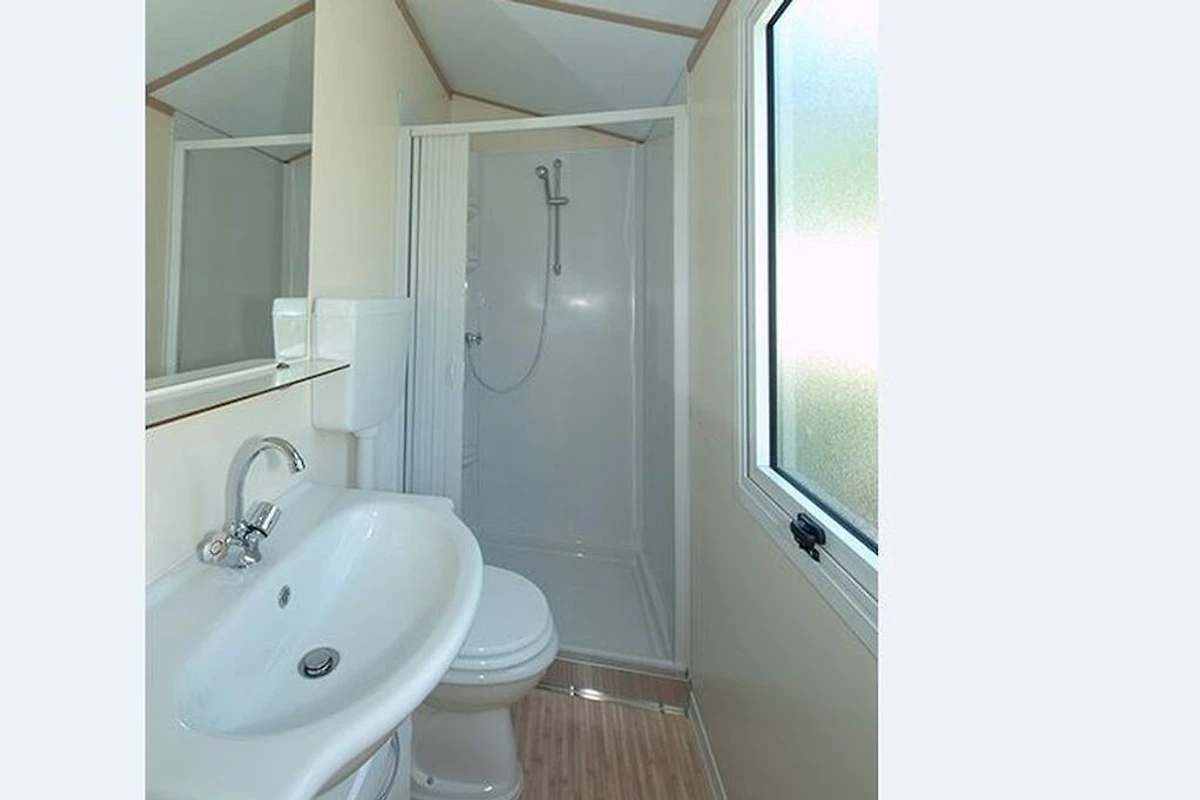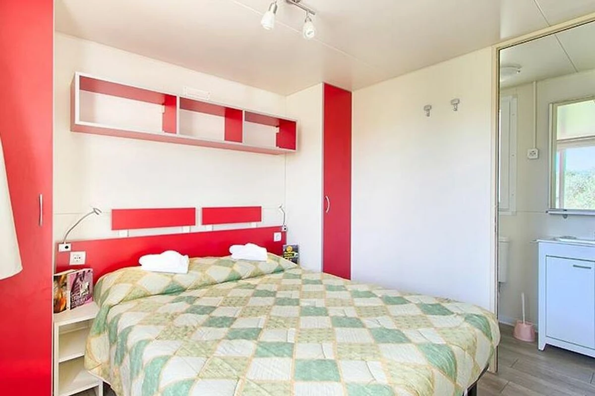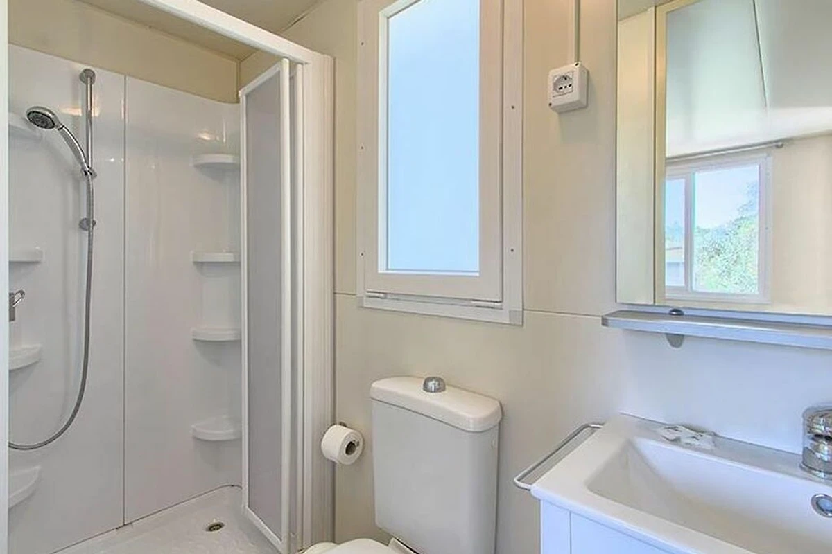 Die Unterkunft Comfort bietet Platz für max. 5 Personen (davon ein Kind bis max. 12 Jahre) und besteht aus einem Elternschlafzimmer mit eigenem Badezimmer sowie einem Kinderzimmer mit zwei Einzelbetten und einem Hochbett (quer). Im Wohnzimmer hat es einen TV. Die gut eingerichtete Küche befindet sich im Wohnbereich und verfügt über Geschirr, Besteck und Pfannen sowie Kühlschrank mit Eisfach. Die beiden Badezimmer verfügen je über eine Dusche sowie Waschbecken und WC. Der gedeckte Sitzplatz, mit Tisch und Stühlen sowie zwei Liegen und Sonnenschirm, lädt zum gemütlichen Entspannen ein, während die Kinder sich auf dem Spielplatz oder am Pool austoben können. Hinweis Wenn Sie mehr als eine Unterkunft benötigen, ist dies bei uns in der Regel möglich, da wir über mehrere Objekte des gleichen Haustyps verfügen.