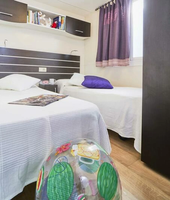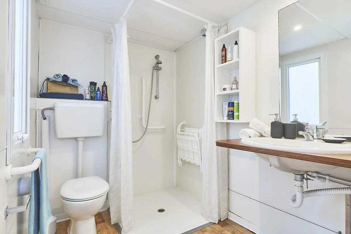 Die rollstuhlgerechte Unterkunft Space ist für maximal 4 Personen und besteht aus einem Elternschlafzimmer, mit einem angrenzenden Badezimmer mit Dusche, WC und Waschbecken, sowie einem Kinderzimmer mit zwei Einzelbetten. Im Wohnbereich hat es ein Bettsofa welches bei Bedarf einer weiteren Person Platz bietet. Die gut eingerichtete Küche befindet sich im Wohnbereich und verfügt über Geschirr, Besteck, Kochtöpfe sowie Kühlschrank mit Eisfach. Das zweite Badezimmer grenzt an den Wohnbereich und ist mit einer Dusche, einem Waschbecken und einem WC ausgestattet. Die überdachte Holzterrasse, mit Tisch, Stühlen sowie zwei Liegen, lädt zum gemütlichen Entspannen ein, während die Kinder sich auf dem Spielplatz oder am Pool austoben können. Fahrzeit ab ital. Grenze ca. 3.5h. Diese Kategorie ist behindertengerecht eingerichtet. Hinweis: Wenn Sie mehr als eine Unterkunft benötigen, ist dies bei uns in der Regel möglich, da wir über mehrere Objekte des gleichen Haustyps verfügen.