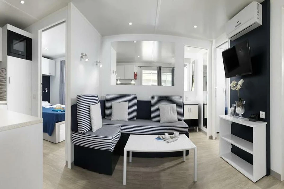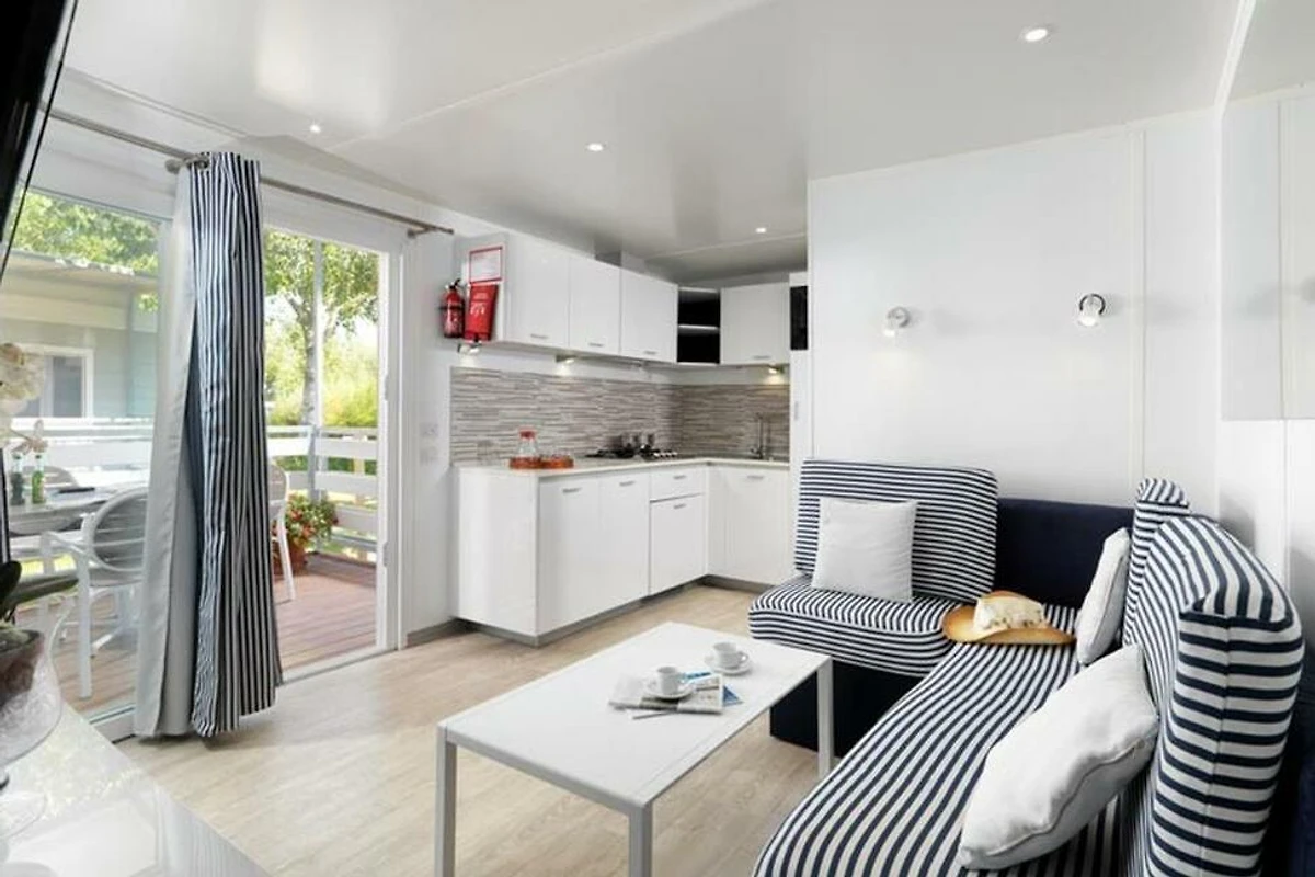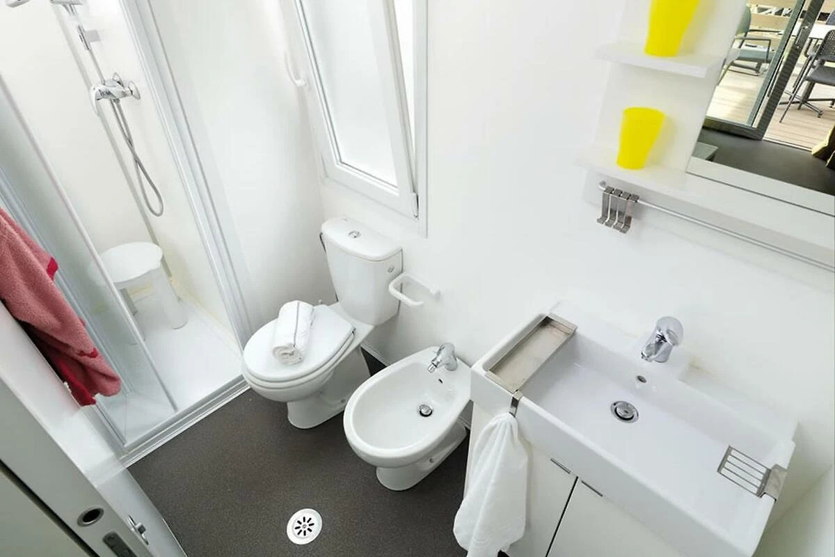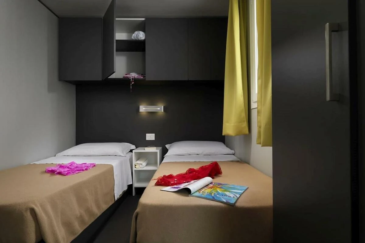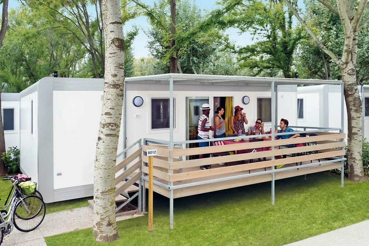 Das Mobilehome Giove XXL ist modern eingerichtet und für bis zu 8 Personen geeignet. Es besteht aus einem Schlafzimmer mit Doppelbett und zwei Zimmern mit jeweils zwei Einzelbetten. Der Wohnbereich bietet auf dem Bettsofa zwei weitere Schlafplätze. Ebenfalls im Wohnbereich befindet sich die gut eingerichtete Küche, welche mit Herd, Töpfen, Geschirr, Besteck, Mikrowelle, Geschirrspüler und einem grossen Kühlschrank mit Eisfach alles besitzt was man für einen gelungenen Urlaub braucht. Das Mobilehome verfügt über zwei Badezimmer, welche jeweils mit einer Dusche, einem WC und einem Waschbecken ausgestattet sind, eines davon verfügt auch über ein Bidet. Ein SAT-TV ist vorhanden. Die überdachte Terrasse lädt mit Tisch und Stühlen zum gemütlichen Verweilen ein, während sich die Kinder am Pool oder auf dem Spielplatz vergnügen. Das Grillen ist erlaubt. Die Fahrzeit ab italienischer Grenze dauert ca. 3h. Seit 201'5 herrscht keine Badekappenpflicht mehr. Hinweis: Wenn Sie mehr als eine Unterkunft benötigen, ist dies bei uns in der Regel möglich, da wir über mehrere Objekte des gleichen Haustyps verfügen.