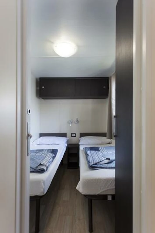 Die Unterkunft Maxicaravan Baia Relax New Plus bietet Platz für max. 5 Personen (davon zwingend ein Kind unter 12 Jahren). Die Unterkunft verfügt über ein Schlafzimmer mit einem Doppelbett und ein Kinderzimmer mit zwei Einzelbetten und einem quer darüber liegenden Hochbet (für Kinder bis max. 50kg). Es gibt ebenfalls Moskitonetze an den Fenstern. Die gut eingerichtete Küchenzeile befindet sich im kombinierten Wohn- und Essbereich und verfügt über einen 4-Flammen-Herd, Geschirr, Besteck, Töpfe, eine italienische Espressokanne sowie einen Kühlschrank mit Eisfach. Das Badezimmer ist mit einem Waschbecken, einer Dusche, einem WC und einem Bidet ausgestattet. Die überdachte und möblierte Veranda lädt zum gemeinsamen Entspannen und Verweilen ein, während sich die Kinder auf dem Rasen austoben können. Grillen ist in der Anlage mit einem Elektro- oder einem Gasgrill erlaubt (bitte Grill selbst mitbringen). Fahrzeit ab italienischer Grenze beträgt etwa 2 Stunden. Hinweis: Wenn Sie mehr als eine Unterkunft benötigen, ist dies bei uns in der Regel möglich, da wir über mehrere Objekte des gleichen Haustyps verfügen.
