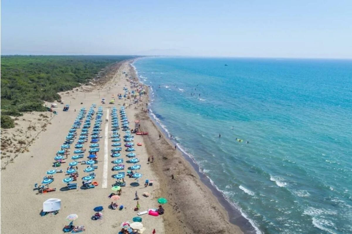 Der flachabfallende, helle Sandstrand ist bequem und direkt vom Feriendorf erreichbar (ca.500 Meter). Ein angenehmer Fussweg führt durch einen Pinienstreifen direkt zum Strand. Der Strand verfügt über sanitäre Anlagen, Bar, Liegenverleih aber auch über sehr viel Platz für Feriengäste welche den freien Sandstrand geniessen möchten.