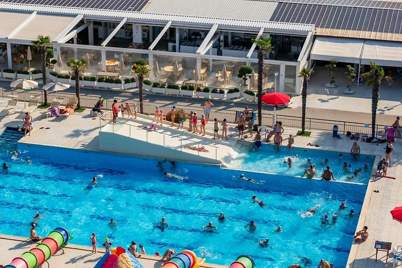 Den Feriengästen stehen ein Kinderpool mit Rutschbahn, ein halbolympischer Pool für Erwachsene, ein Babybecken mit sehr geringer tiefe und ein Whirlpool zur Verfügung. Der Whirlpool garantiert den erwachsenen Gästen die komplette Entspannung. Es werden zahlreiche Schwimmkurse und Sportaktivitäten durch das Animationsteam durchgeführt. Zur Erholung stehen grosse Liegeflächen mit Liegen und Sonnenschirmen zur Verfügung.