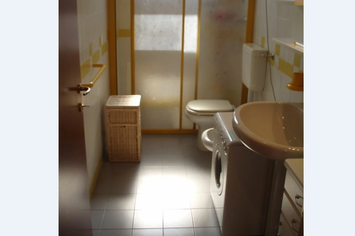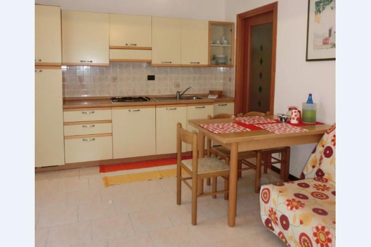 Die 2 Zimmer-Wohnung Tipo B* Erdgeschoss AGMC bietet Platz für max. 5 Personen (eine Überbelegung mit einem Baby im Reisebett ist möglich, jedoch muss bei der Buchung zwingend angemeldet werden) und befindet sich im Erdgeschoss. Die Wohnung verfügt über ein Schlafzimmer mit einem Doppel- und einem Einzelbett. Im Wohnbereich bietet ein Doppelbettsofa bei Bedarf zwei weitere Schlafplätze. Eine gut eingerichtete Kochnische mit Herd, Geschirr, Besteck, Töpfen, italienischer Espressokanne und Kühlschrank mit Eisfach befindet sich ebenfalls im Wohnbereich. Das Badezimmer ist mit einer Dusche, einem Waschbecken, einem Bidet, sowie einem WC ausgestattet. Die Fahrzeit ab italienischer Grenze beträgt ca. 4h. Hinweis: Wenn Sie mehr als eine Unterkunft benötigen, ist dies bei uns in der Regel möglich, da wir über mehrere Objekte des gleichen Haustyps verfügen.