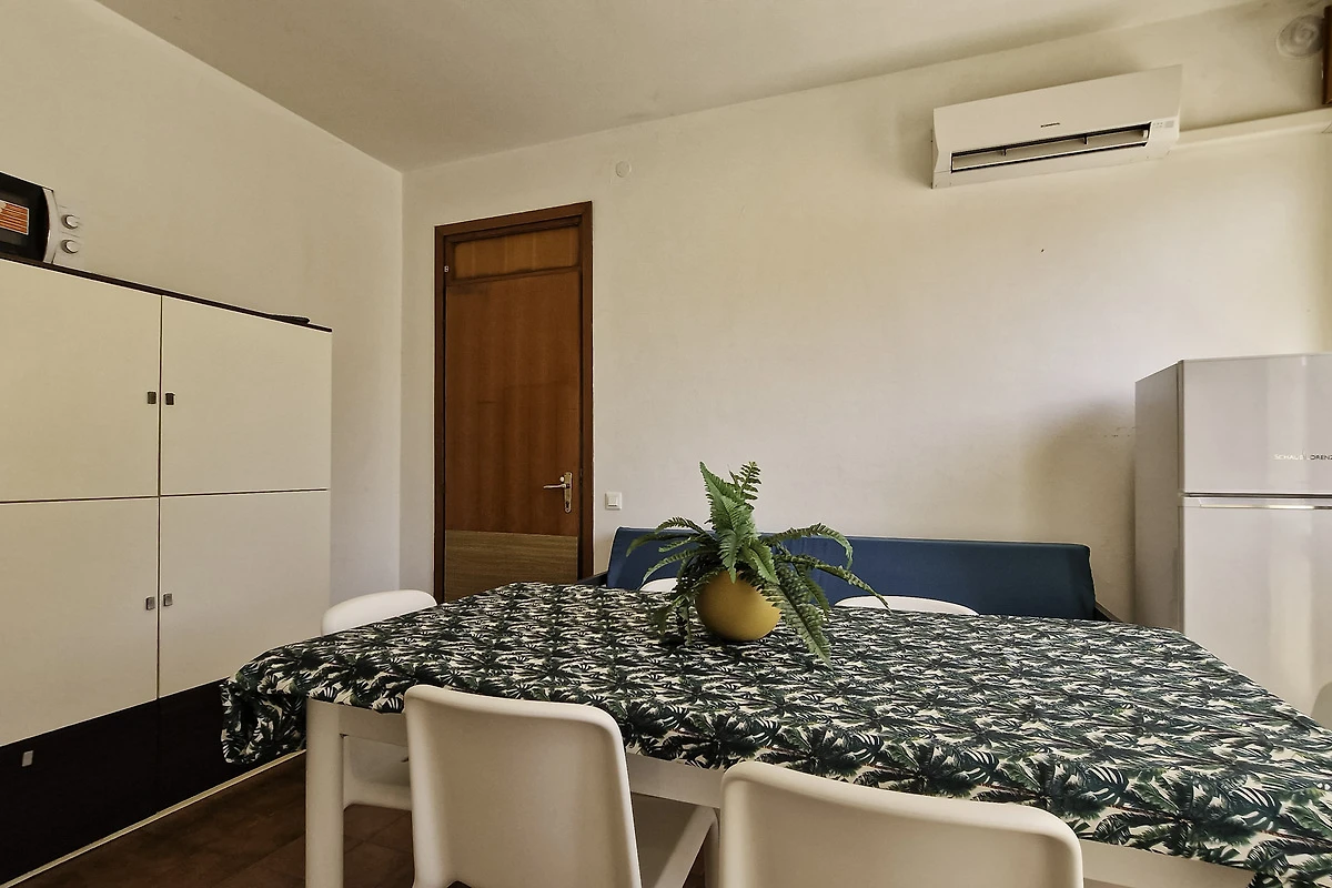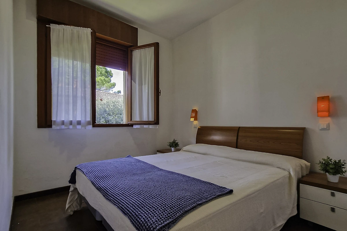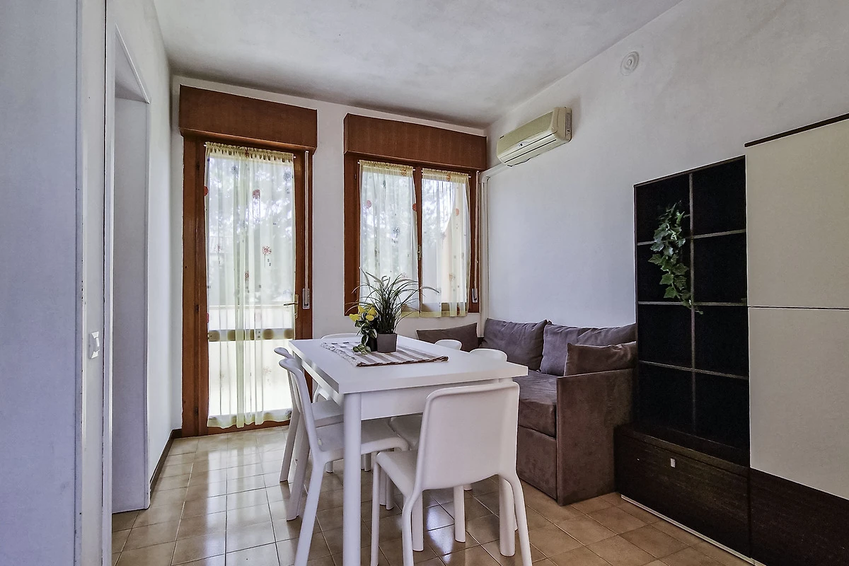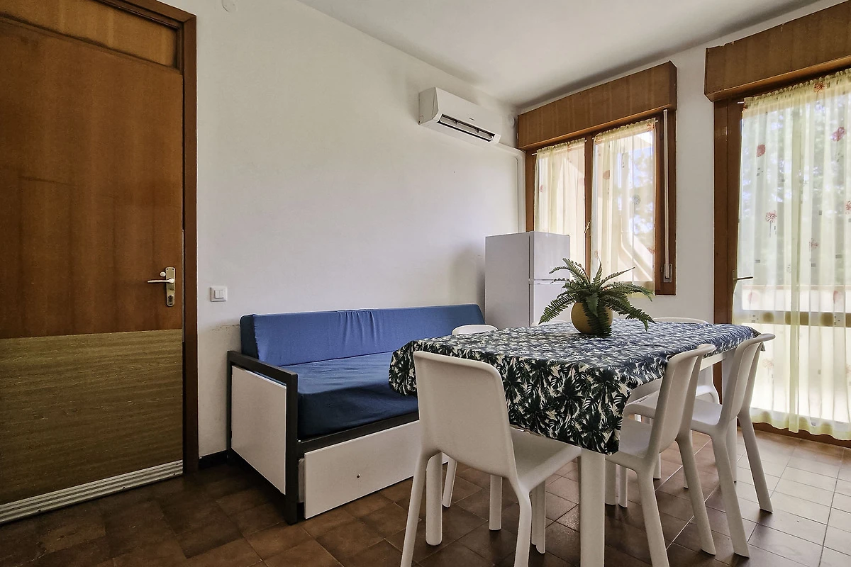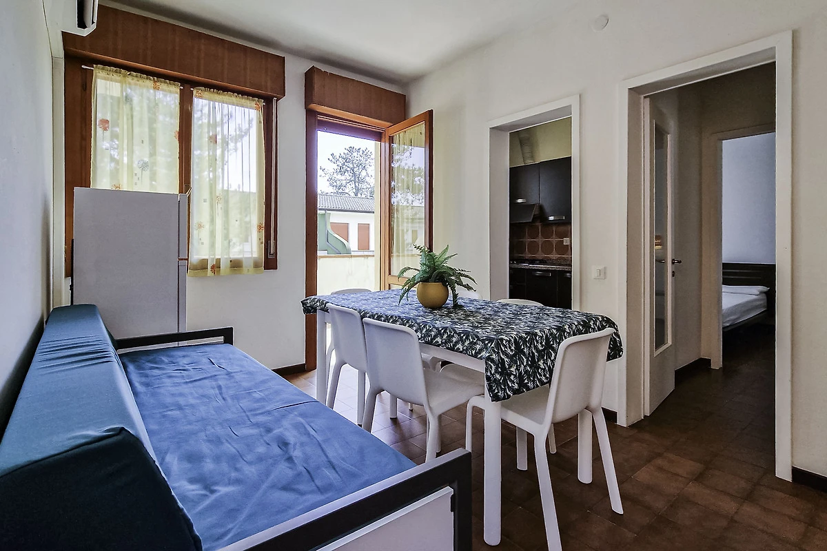 Die einfach und zweckmässige Dreizimmer-Wohnung Tipo C* befindet sich entweder im Erdgeschoss oder im ersten Stock eines Reihenferienhauses und bietet Platz für max. 6 Personen. Die Unterkunft besteht aus einem Schlafzimmer mit einem Doppelbett und einem Schlafzimmer mit zwei Einzelbetten. Zwei weitere Schlafplätze bietet das Doppelschlafsofa im Wohnzimmer. Im Wohnbereich befindet sich ausserdem die gut eingerichtete Küche mit Geschirr, Besteck, Töpfen, Espressokanne, einem Kühlschrank mit Eisfach und einem Gasherd. Eine Klimaanlage ist vorhanden. Das Badezimmer verfügt über eine Dusche, ein WC und ein Waschbecken. Die Terrasse mit Tisch, Stühlen und einem kleinen, von Hecken umzäunten Garten oder der mobilierte Balkon laden zum gemütlichen Entspannen ein, während sich die Kinder am Pool austoben können. Die Fahrzeit ab italienischer Grenze beträgt ca. 4h. Hinweis: Wenn Sie mehr als eine Unterkunft benötigen, ist dies bei uns in der Regel möglich, da wir über mehrere Objekte des gleichen Haustyps verfügen. Bitte nehmen Sie daher zur Kenntnis, dass die Inneneinrichtung daher leicht variieren kann.