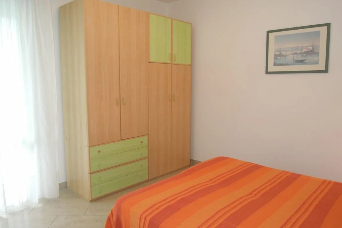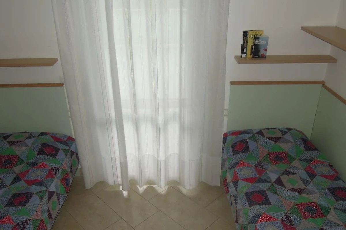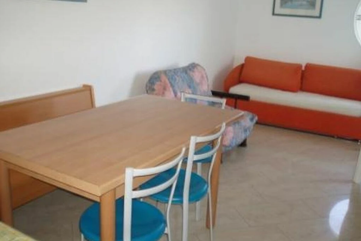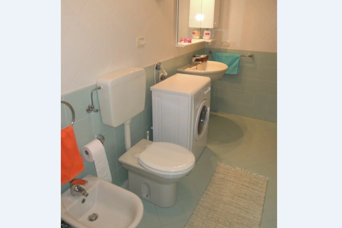 Die 3 Zimmer-Wohnung Trilo C2*bietet Platz für max. 6 Personen. Die Wohnung verfügt über ein Schlafzimmer mit einem Doppelbett und ein Zimmer mit zwei Einzelbetten. Im Wohnbereich bietet ein Doppelbettsofa bei Bedarf zwei weitere Schlafplätze. Eine gut eingerichtete Kochnische mit Herd, Geschirr, Besteck, Töpfen, Mikrowelle, italienischer Espressokanne und Kühlschrank mit Eisfach befindet sich ebenfalls im Wohnbereich. Das Badezimmer ist mit einer Dusche, einem Waschbecken, einem Bidet, sowie einem WC ausgestattet. Die Wohnung verfügt zudem über einen überdachten Balkon, welcher mit Tisch und Stühlen zum Verweilen einlädt. Die Fahrzeit ab italienischer Grenze beträgt ca. 4h. Hinweis: Wenn Sie mehr als eine Unterkunft benötigen, ist dies bei uns in der Regel möglich, da wir über mehrere Objekte des gleichen Haustyps verfügen.
