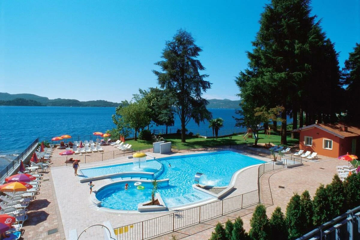 Der Swimmingpool der Anlage mit Sonnenliegen- und Schirmen und einem atemberaubenden, direkten Blick auf den Lago Maggiore sorgt für eine wohltuende Abkühlung in den Sommermonaten.