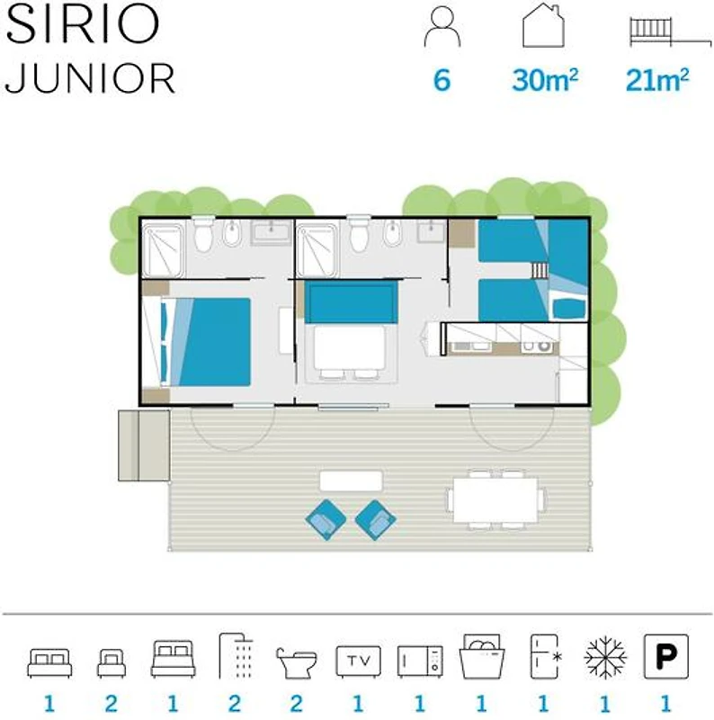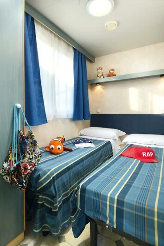 Das Mobilehome Bellagio Large ist modern eingerichtet und für bis zu 6 Personen geeignet. Es besteht aus einem Schlafzimmer mit Doppelbett und einem Zimmer mit zwei Einzelbetten. Der Wohnbereich bietet auf dem Doppelbettsofa Platz für zwei weitere Personen. Ebenfalls im Wohnbereich befindet sich die gut eingerichtete Küche, welche mit Induktionsherd, Töpfen, Geschirr, Besteck, Mikrowelle, Geschirrspüler und einem grossen Kühlschrank mit Eisfach alles besitzt was man für einen gelungenen Urlaub braucht. Das Mobilehome verfügt über ein Badezimmer mit einer Dusche, WC, Bidet und einem Waschbecken. Ein SAT-TV und eine Klimaanlage sind vorhanden. Die überdachte Terrasse lädt mit Tisch und Stühlen zum gemütlichen Verweilen ein, während sich die Kinder am Pool oder auf dem Spielplatz vergnügen. Das Grillen ist erlaubt. Die Fahrzeit ab italienischer Grenze dauert ca. 3h. Hinweis: Wenn Sie mehr als eine Unterkunft benötigen, ist dies bei uns in der Regel möglich, da wir über mehrere Objekte des gleichen Haustyps verfügen.