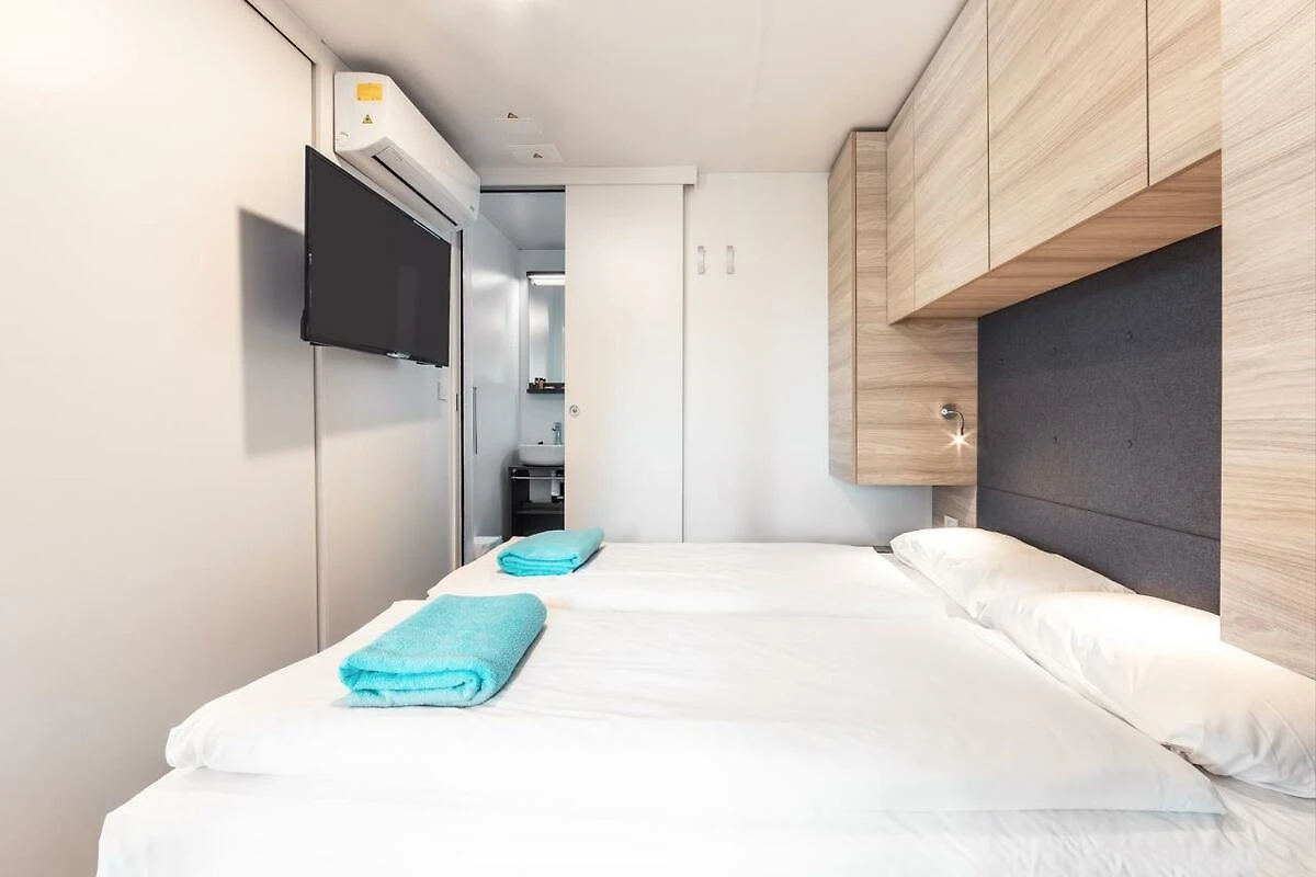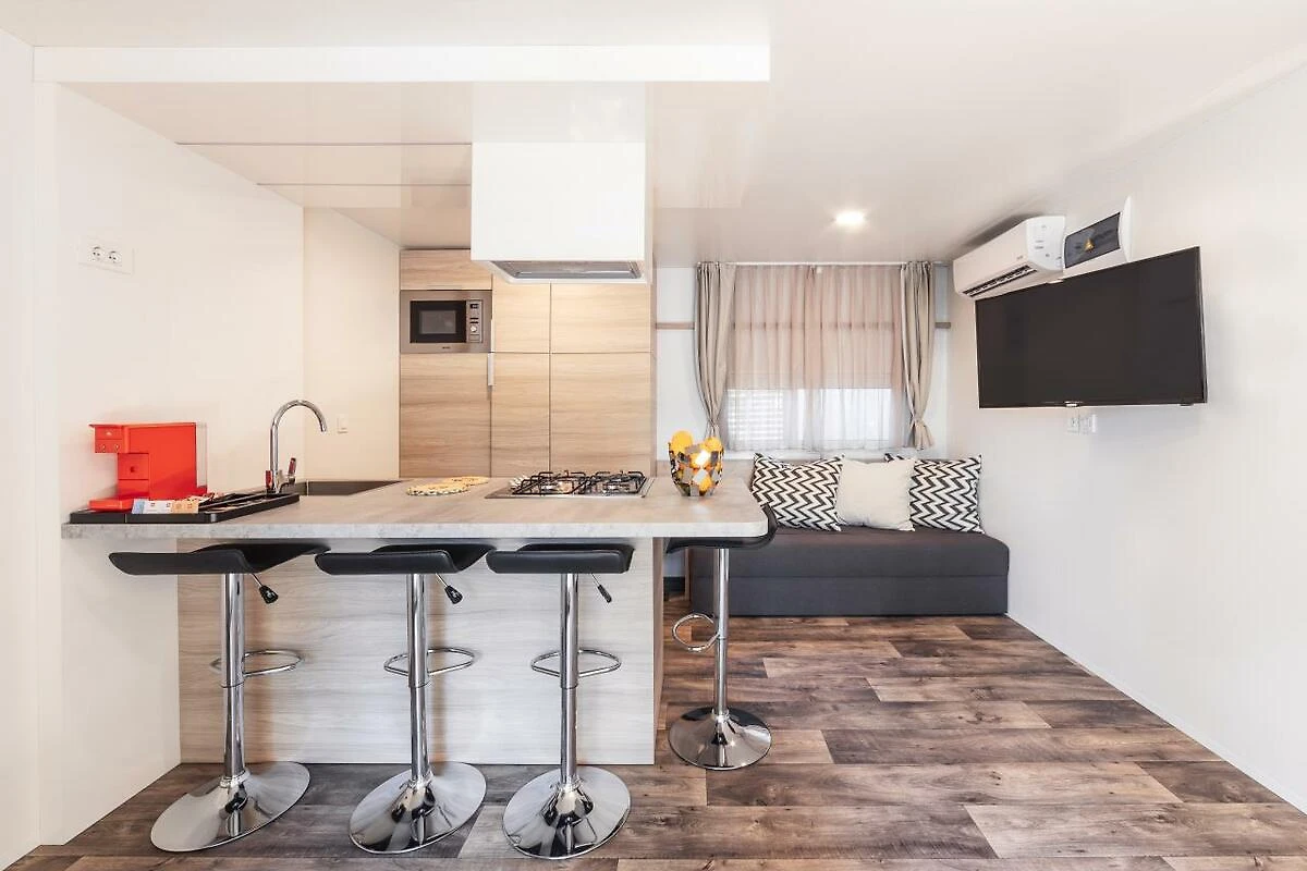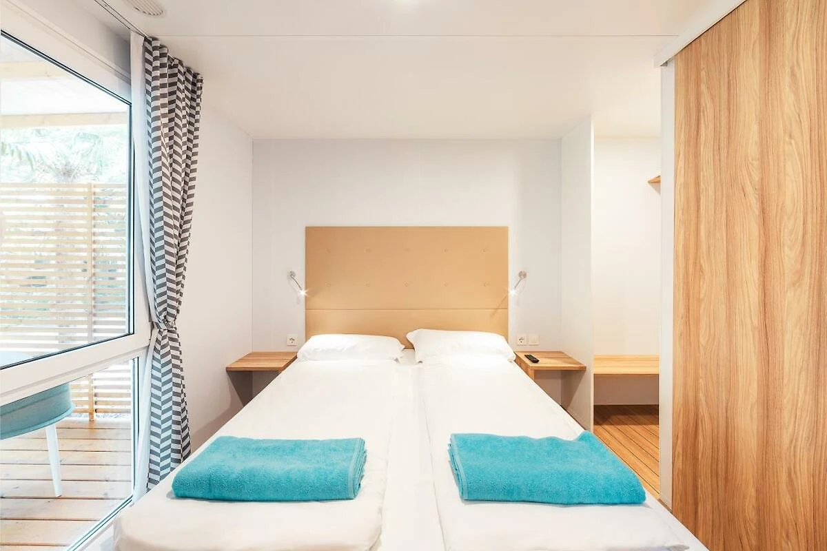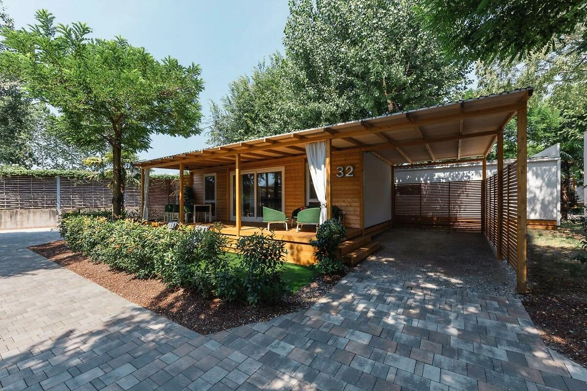 Das moderne und komfortabel eingerichtete Cottage bietet Platz für max. 4 Personen und besteht aus zwei Schlafzimmern mit Doppelbett, sowie einem Wohnbereich mit Sofa und SAT-Fernseher. Ebenfalls im Wohnbereich befindet sich ein Tisch mit Stühlen. Die gut eingerichtete Küche befindet sich im Wohnbereich und verfügt über Induktionsherd, Geschirr, Besteck, Töpfe, Wasserkocher, Mokka-Kaffeemaschine, Mikrowelle, Spülmaschine, sowie einen Kühlschrank. Die beiden Badezimmer sind mit einer Dusche, einem Waschbecken, einem WC, sowie einem Haartrockner ausgestattet. Die überdachte Holzterrasse ist möbliert und lädt zum Entspannen ein. Im eingezäunten Gartenabschnitt vor der Unterkunft stehen zwei Sonnenliegen für Sie bereit.Der Parkplatz ist direkt neben der Unterkunft und überdacht. Fahrzeit ab italienischer Grenze ca. 2h. Hinweis: Wenn Sie mehr als eine Unterkunft benötigen, ist dies bei uns in der Regel möglich, da wir über mehrere Objekte des gleichen Haustyps verfügen.