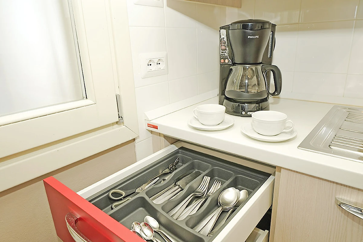 Die Unterkunft verfügt über eine gut eingerichtete Küche mit Herd, Geschirr, Besteck, Töpfe, Kaffeemaschine, Wasserkocher, Mikrowelle sowie einen Kühlschrank. Auch Einkaufsmöglichkeiten liegen in der Umgebung. Die Ferienanlage hat ein Restaurant in welchem verschiedene mediterrane Gerichte und Pizzen angeboten werden. Das Restaurant hat eine wundervolle Terrasse mit direktem Blick auf den Gardasee und eine gut eingerichtete Kinderecke. Falls Sie gerne von Frühstück oder Halbpension Gebrauch machen möchten, können Sie diese gerne vor Ort dazu buchen (eine Voranmeldung ist nicht nötig). Im Restaurant kann frisches Brot gekauft werden und es bietet auch Takeaway an.