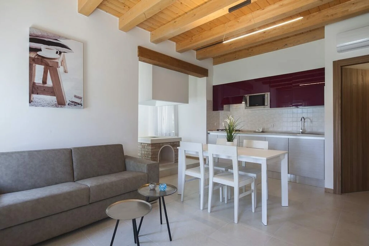 Die schönen Wohnungen der 2017 erbauten Landhäuser Ca’ del Pioppo befinden sich inmitten der Natur auf der Landzunge von Cavallino-Treporti. Die beiden Landhäuser der Anlage sind von einem wunderschönen, eingezäunten Garten mit Bäumen umgeben, den Sie gerne nutzen dürfen. Die Wohnungen sind geschmackvoll eingerichtet und perfekt geeignet für diejenigen, die besonders am Abend Ruhe suchen. Circa 1km entfernt liegt das Camping Village Cavallino, dessen Dienstleistungen den Gästen zur Verfügung stehen. Zu diesen zählt ein Wasserpark mit Wellnesszonen, Restaurants, eine Panorama-Lounge-Bar, in den Sommermonaten ein Animationsprogramm für Erwachsene und Kinder, sowie ein Wellness- und Spa-Center (gegen Gebühr).