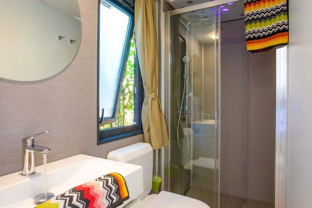 Das 34qm grosse Mobilehome Baia New Project ist modern, hell und bequem. Es verfügt über zwei Schlafzimmer, eines ist mit einem Doppelbett und eines mit zwei Einzelbetten und einem Hochbett (für ein Kind bis max. 11 Jahre) ausgestattet. Die Küchenzeile verfügt über einen Herd, eine Spüle, Besteck, Geschirr, Töpfe und einen Kühlschrank mit Gefrierfach. Der kombinierte Wohn- und Essbereich ist mit einem Sofa und einem SAT-TV ausgestattet. Das Bad verfügt über eine Dusche, WC, Bidet und Waschbecken. Eine halbüberdachte Holzterrasse mit Tisch und Stühlen lädt zum Entspannen ein. Hinweis: Wenn Sie mehr als eine Unterkunft benötigen, ist dies bei uns in der Regel möglich, da wir über mehrere Objekte des gleichen Haustyps verfügen.