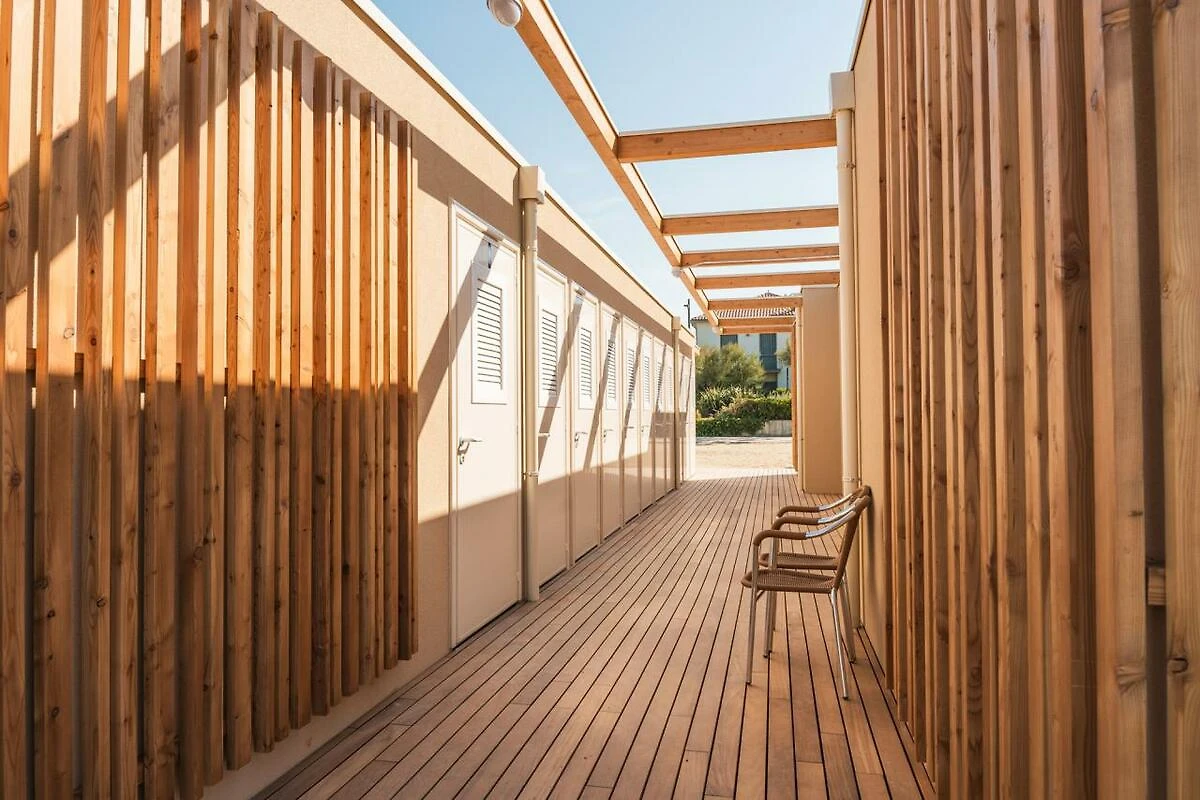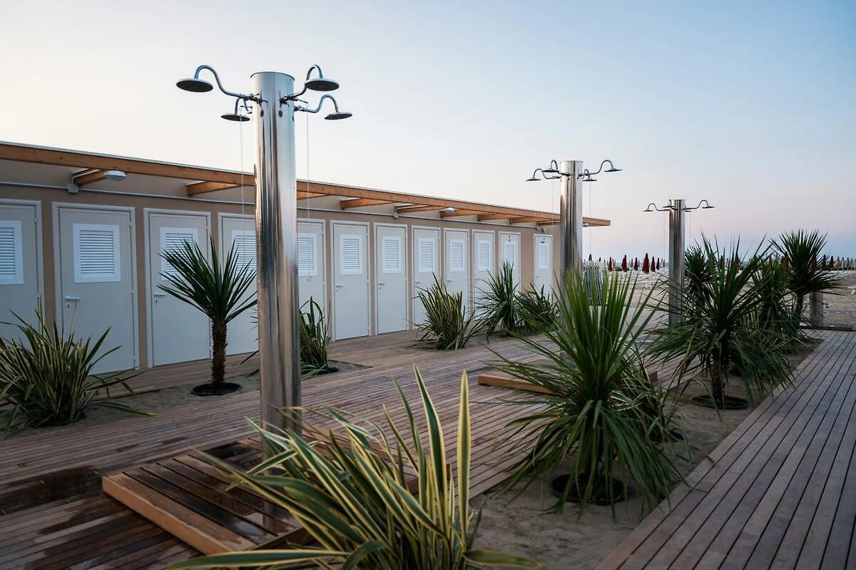 Der Ferienpark ist nur durch eine Strandpromenade vom breiten, flach abfallenden Sandstrand getrennt. Sonnenschirme und Liegen können gebucht werden. Ein Restaurant sowie Duschen und Toiletten sind vorhanden.