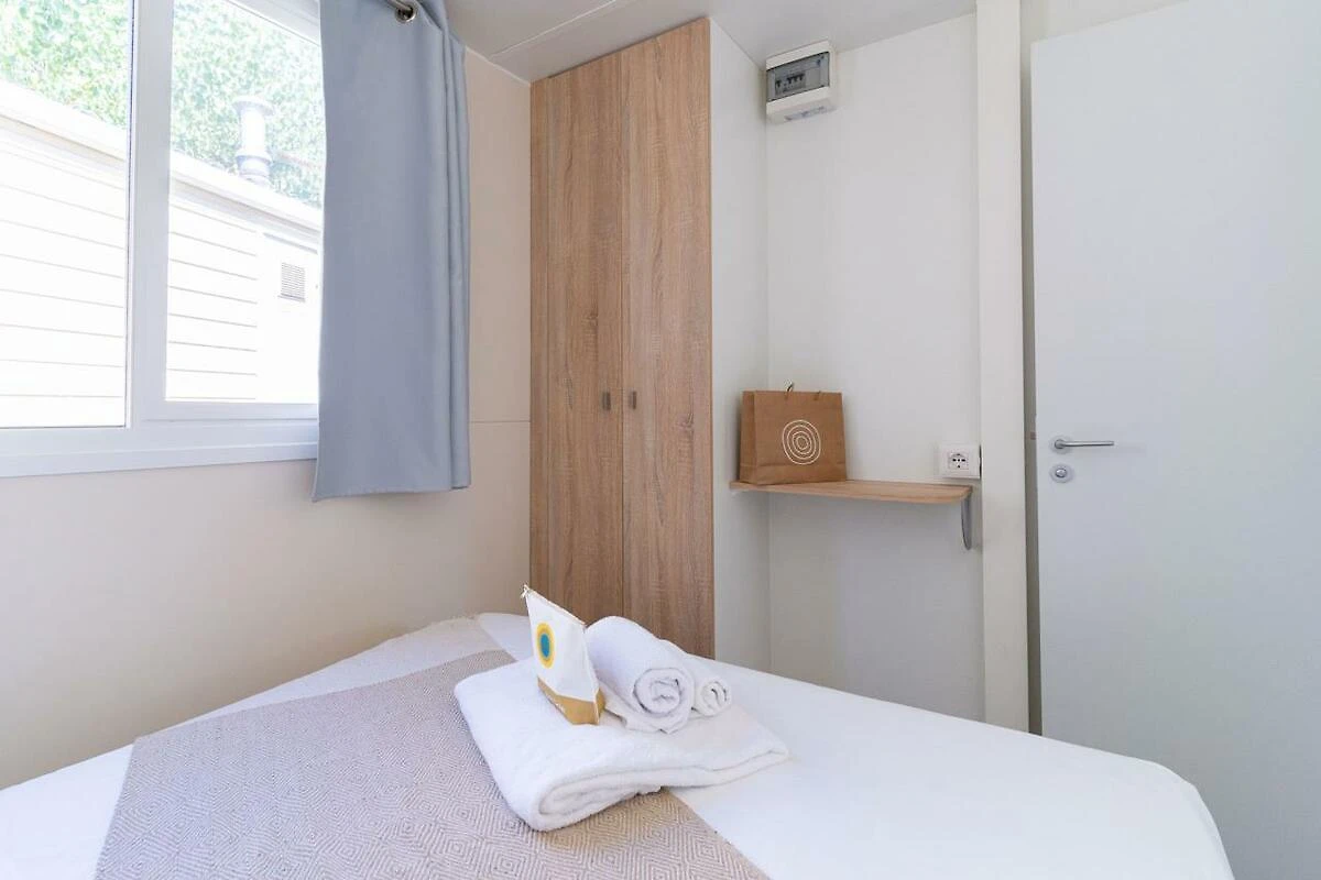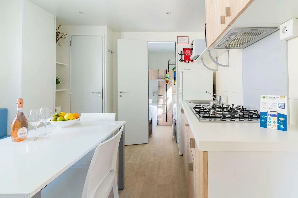 Das Mobilehome Lodge bietet Platz für maximal 5 Personen und verfügt über ein Schlafzimmer mit Doppelbett, sowie einem zweiten Schlafzimmer mit zwei Einzelbetten und einem Hochbett (für ein Kind unter 10 Jahren). Der Wohn- und Essbereich verfügt über einen SAT-TV, sowie eine Küchenzeile mit einem Herd, Geschirr, Besteck, Töpfen, Pfannen, Mikrowelle und einem Kühlschrank mit Eisfach. Eine Sitzbank, ein Tisch und Stühle sind ebenfalls vorhanden. Die Unterkunft verfügt über zwei Badezimmer mit jeweils einem WC, Dusche und Waschbecken. Die überdachte Holzterrasse mit Tisch und Stühlen lädt zum gemütlichen Entspannen ein, während die Kinder sich auf dem Spielplatz oder am Pool austoben können. Fahrzeit am ital. Grenze ca. 4 h. Hinweis: Wenn Sie mehr als eine Unterkunft benötigen, ist dies bei uns in der Regel möglich, da wir über mehrere Objekte des gleichen Haustyps verfügen.