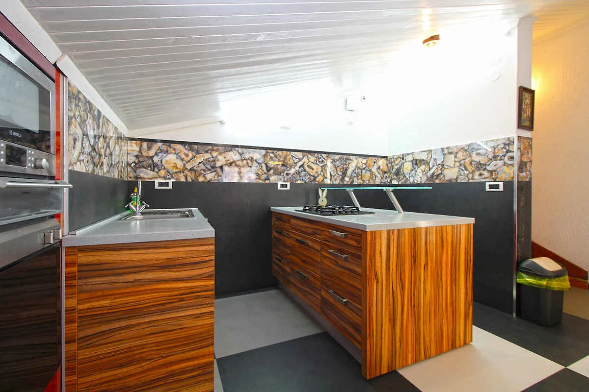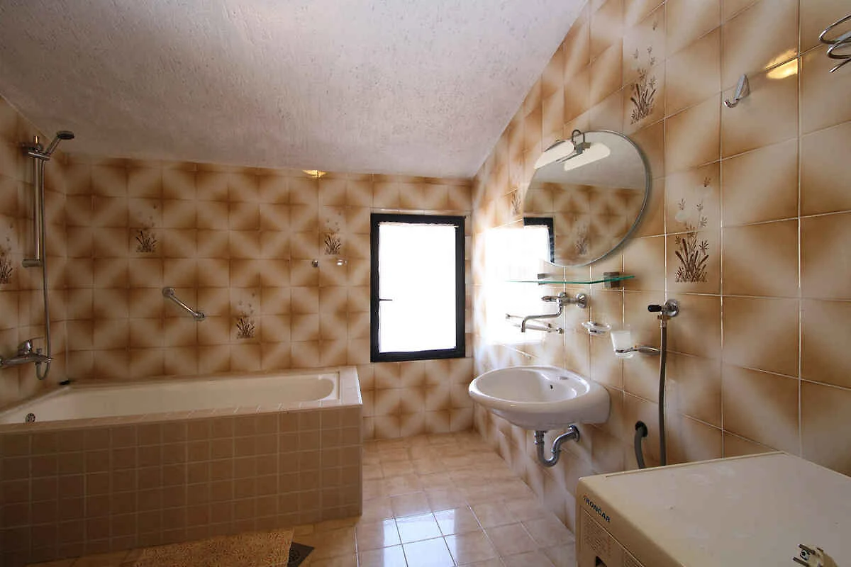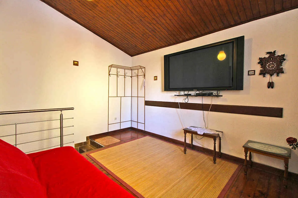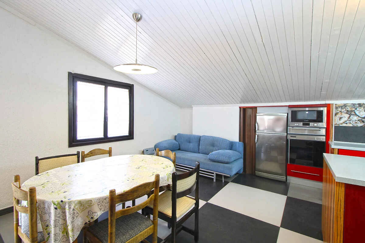 und führt über eine Innentreppe. Wohnzimmer (10 qm) mit Sitzecke und TV. 2 Schlafzimmer jeweils (17 qm) mit 1 Doppelbett und 1 Einzelbett. Küche (20 qm) mit Essecke (6 Plätze), Gasherd, Elektroherd, Backofen, Kühlschrank (Eisfach), Mikrowelle, Kaffeemaschine, elektrischem Wasserkocher und Zugang zum Balkon (10 qm, überdacht, Gartenmöbel). Bad (8 qm) mit Badewanne, Waschmaschine, 1 Waschbecken, WC, Bidet und Föhn.