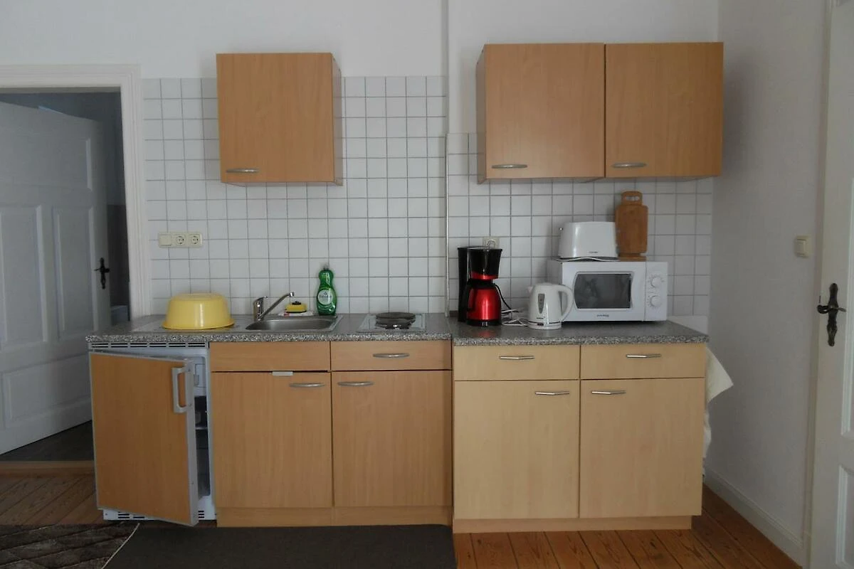Es erwartet Sie eine gemütlich eingerichtete Ferienwohnung mit Wohnzimmer und offener Küche, einem Schlafzimmer mit Doppelbett und Schlafcouch für 1 Person. Ein Kinderreisebett und Hochstuhl stehen kostenfrei zur Verfügung. Das Duschbad mit Fenster ist gerade modernisiert und verfügt über eine bodengleiche Dusche. TV, Radio und WLAN fehlen natürliich auch nicht. Ihre Fahrräder können Sie sicher abstellen auf dem abgeschlossenen Hof.
