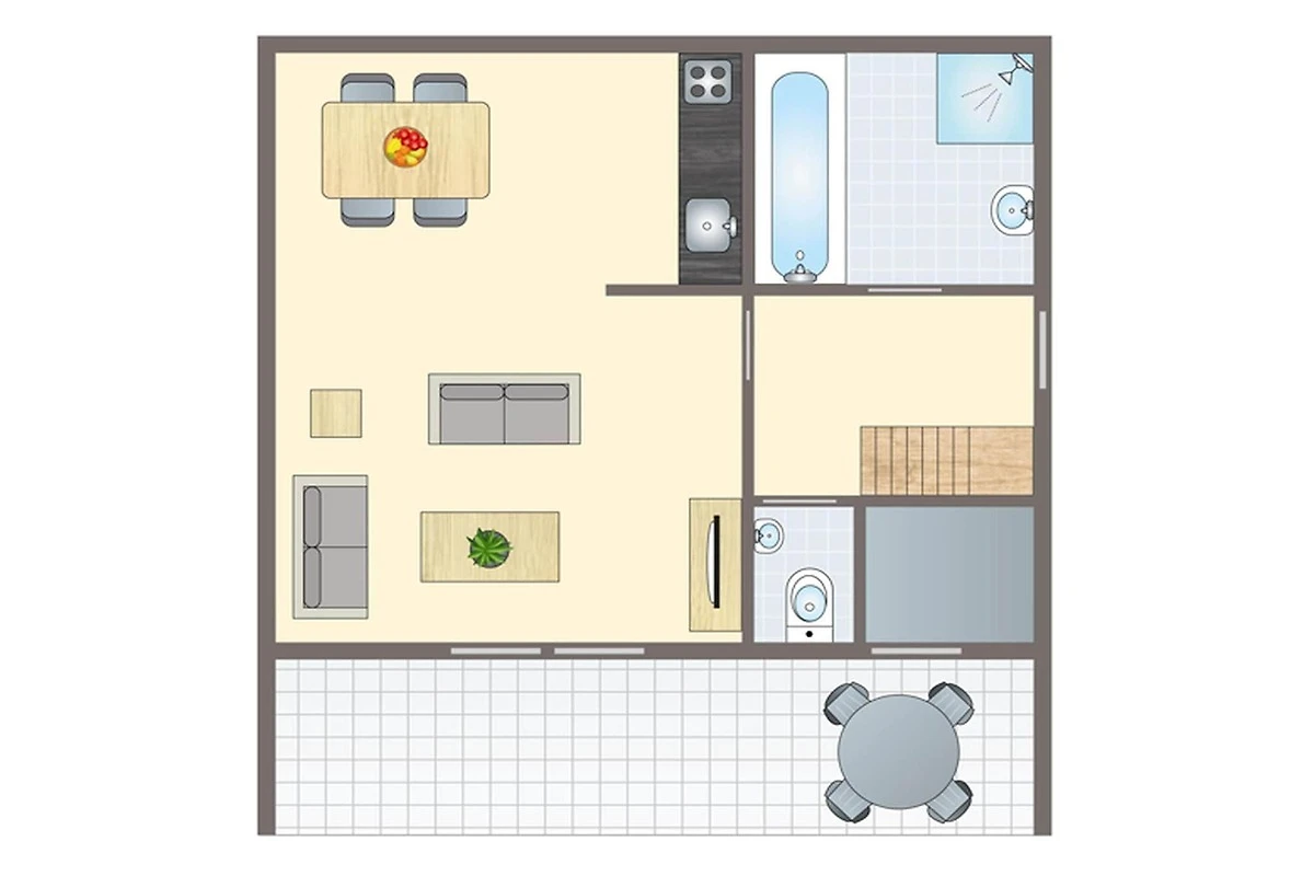 Das Leben im Freien findet im Garten mit Terrasse und Gartenmöbeln statt. Das Haus verfügt über einen Abstellraum und bietet einen Parkplatz für ein Auto. Zudem gibt es im Ferienpark weitere Parkmöglichkeiten auf den zentralen Parkplätzen.