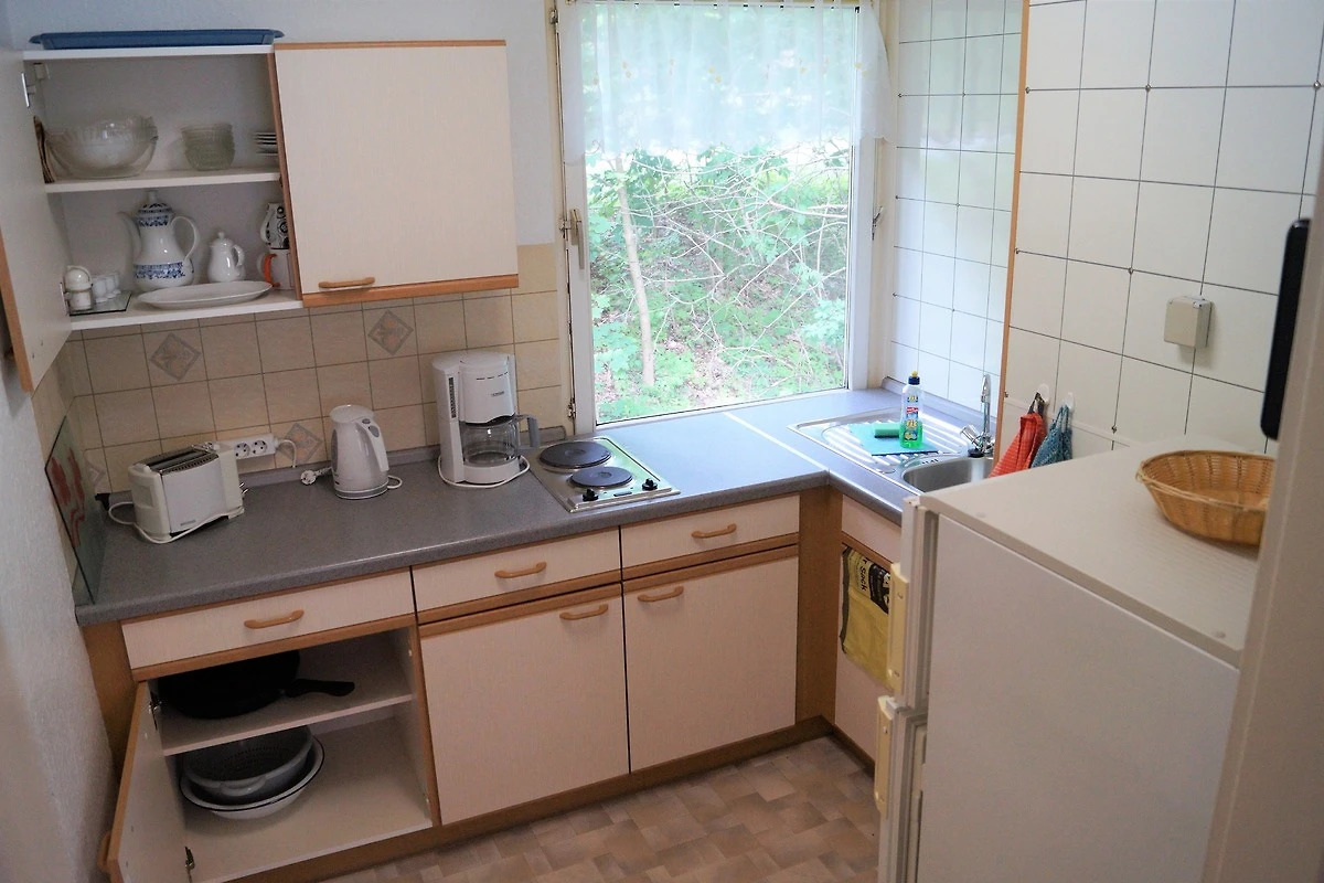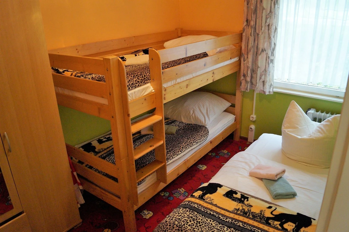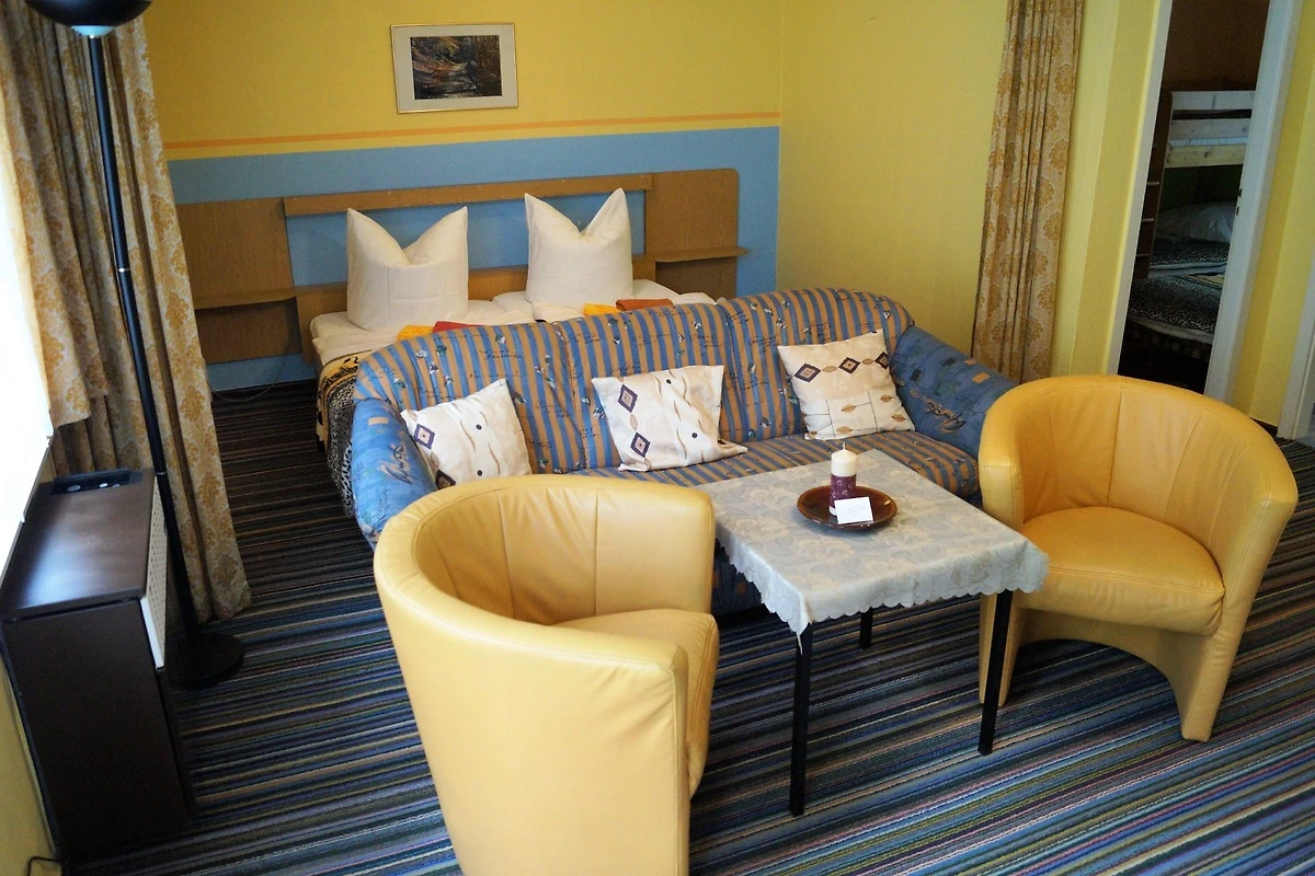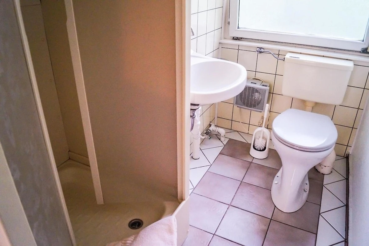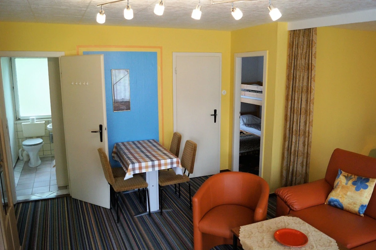 Doppelhaus Typ 1 ist eine Doppelhaushälfte für bis zu 5 Pers. (4 Erw. + 1 Kind). Die Nutzfläche beträgt ca. 45m² incl. einer mit Gartenmöbeln ausgestatteten Terrasse, einem trennbaren Wohnschlafraum mit Doppelbett, einem Schlafraum mit 2 Betten, davon ein Etagenbett, einer komplett eingerichteten Küche mit Elektrokochplatten, Kühlschrank, Spüle, Kaffeemaschine etc. sowie einem Bad mit Dusche & WC.