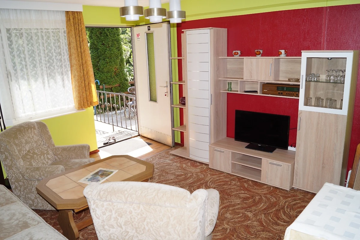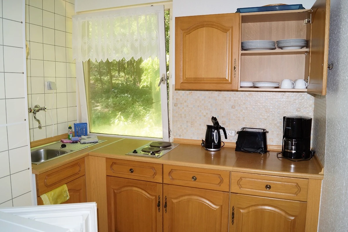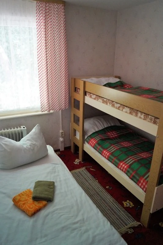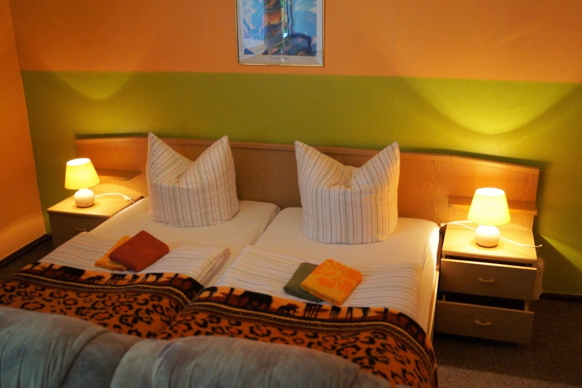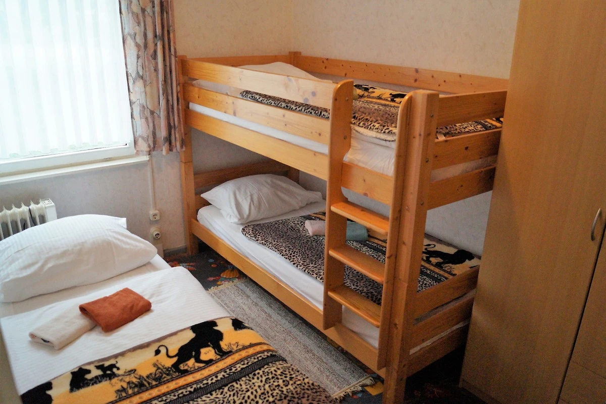 Doppelhaus Typ 1 ist eine Doppelhaushälfte für bis zu 5 Pers. (4 Erw. + 1 Kind). Die Nutzfläche beträgt ca. 45m² incl. einer mit Gartenmöbeln ausgestatteten Terrasse, einem trennbaren Wohnschlafraum mit Doppelbett, einem Schlafraum mit 2 Betten, davon ein Etagenbett, einer komplett eingerichteten Küche mit Elektrokochplatten, Kühlschrank, Spüle, Kaffeemaschine etc. sowie einem Bad mit Dusche & WC.