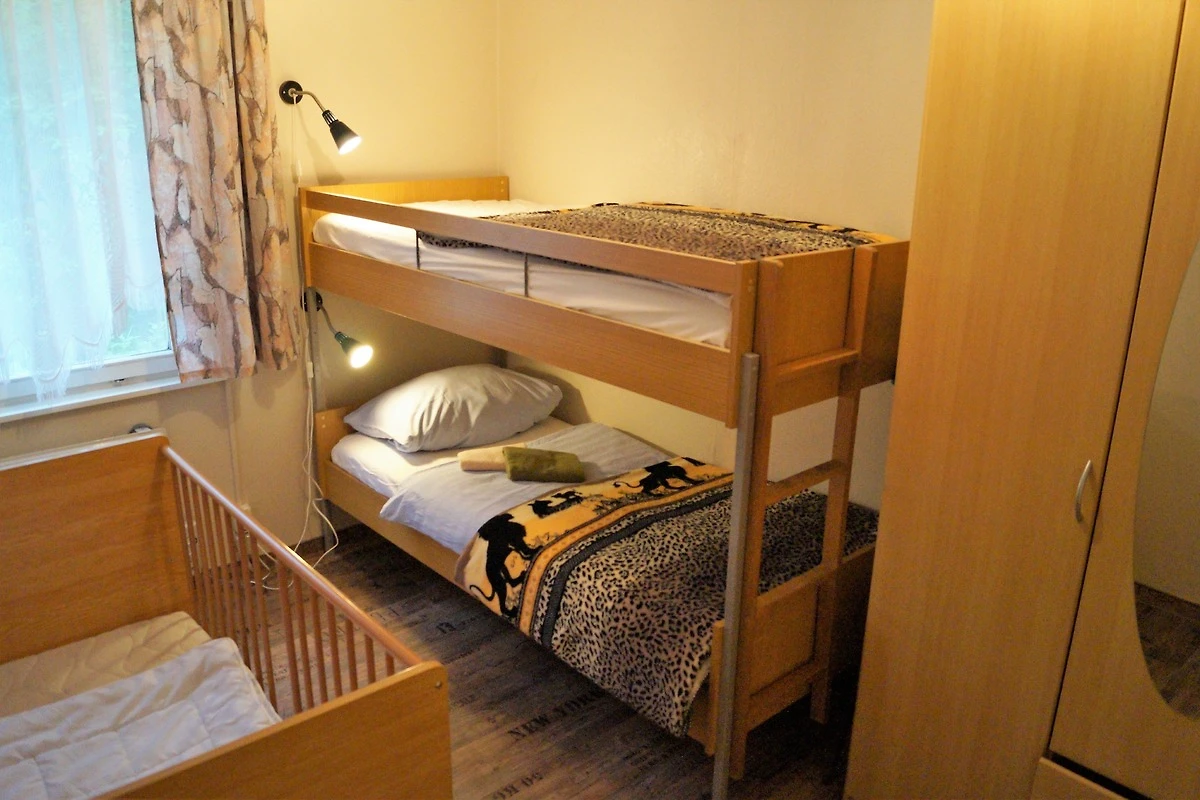 Doppelhaus Typ 5 ist eine Doppelhaushälfte für bis zu 5 Pers. (3Erw.+1Kind+1Kleinkind). Die Nutzfläche beträgt ca. 45m² incl. einer mit Gartenmöbeln ausgestatteten Terrasse, einem trennbaren Wohnschlafraum mit Doppelbett, einem Schlafraum mit Etagenbett & Kinderbett, einer komplett eingerichteten Küche mit Elektrokochplatten, Kühlschrank, Spüle, Kaffeemaschine etc. sowie einem Bad mit Dusche & WC.
